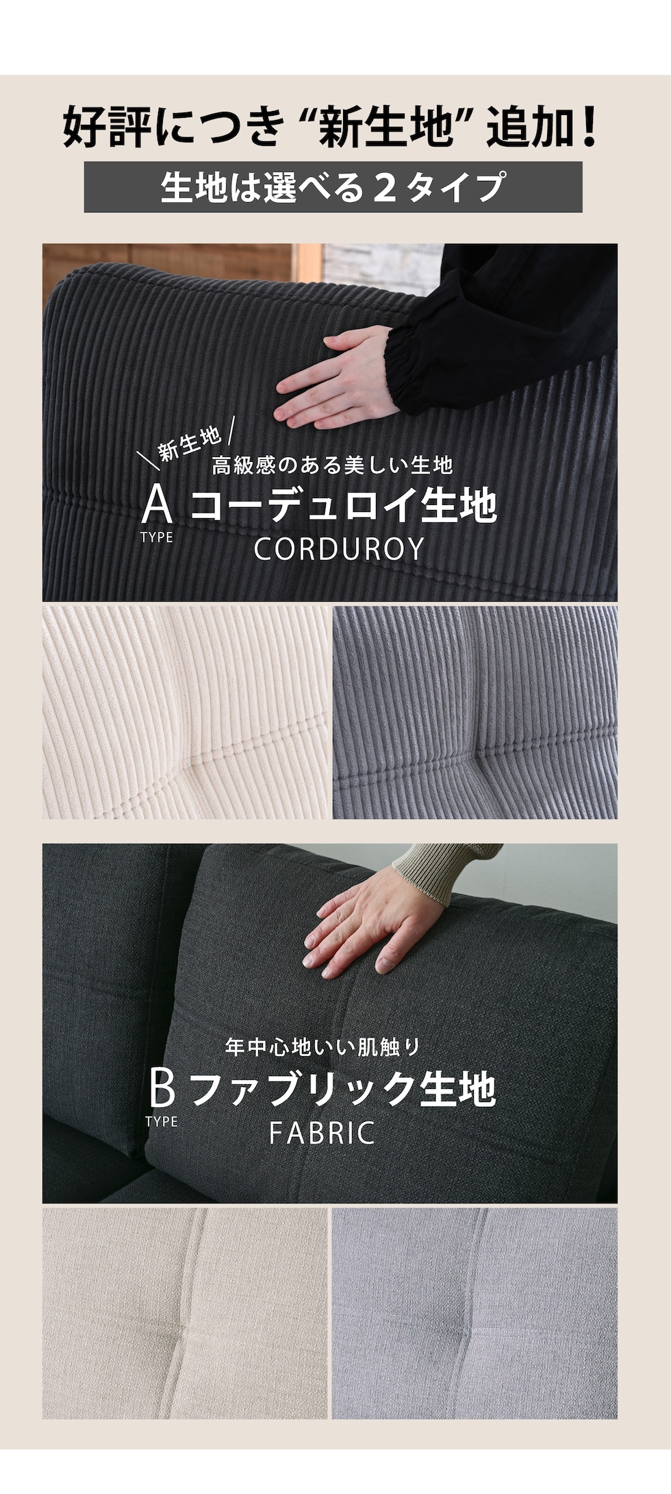 | 素材 | 張地:ファブリック/コーデュロイ 背もたれ内部:シリコンフィル、ウレタンチップ 座面内部:Sバネ、ウレタンフォーム |