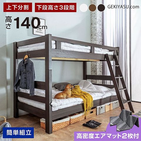 ・場所を選ばないコンパクトサイズ 高さ140cm ・上下分割可能で、生活に合わせシングルベッドとしても ・下段は高さ3段階調整可能 ・下段はサイドフレームがなく、小さなお子様でも出入りが楽 ・ベッド下は収納スペースとしても使えます ・斜めはしごで昇り降りの安定感抜群 ・シンプルな平柱タイプで、寮などでも活躍 ・通気性が良く、丈夫なLVLすのこ |
