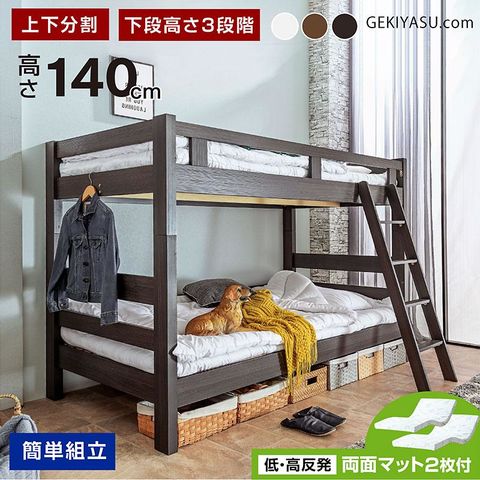 ・場所を選ばないコンパクトサイズ 高さ140cm ・上下分割可能で、生活に合わせシングルベッドとしても ・下段は高さ3段階調整可能 ・下段はサイドフレームがなく、小さなお子様でも出入りが楽 ・ベッド下は収納スペースとしても使えます ・斜めはしごで昇り降りの安定感抜群 ・シンプルな平柱タイプで、寮などでも活躍 ・通気性が良く、丈夫なLVLすのこ |