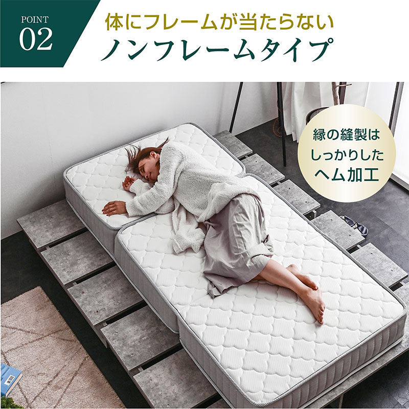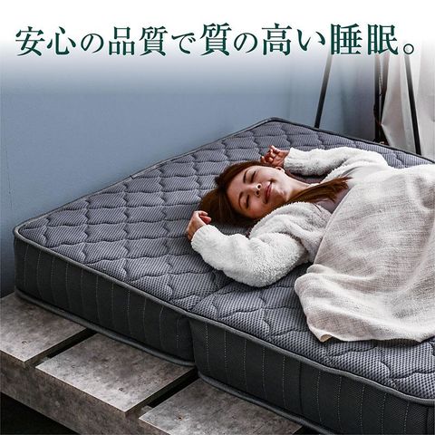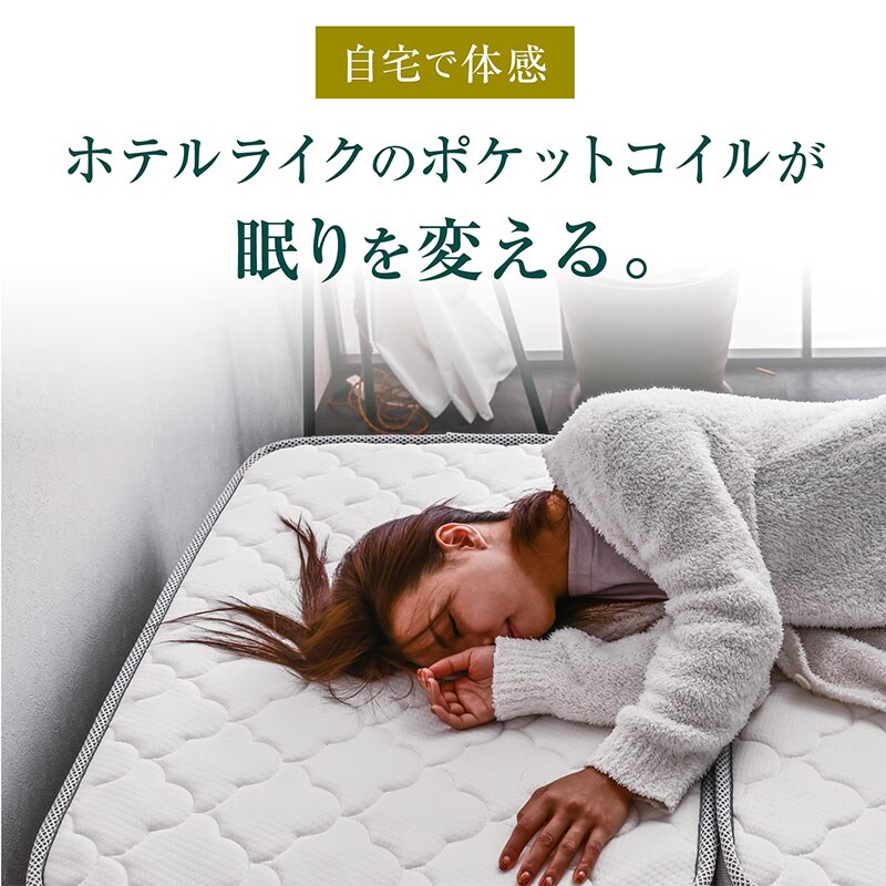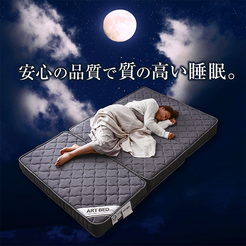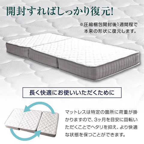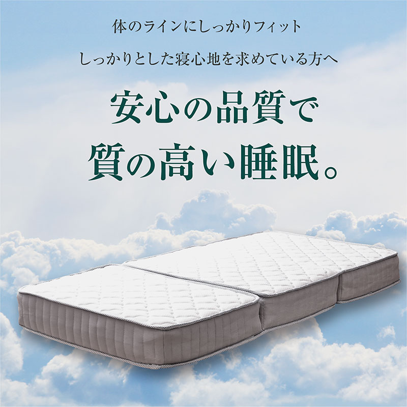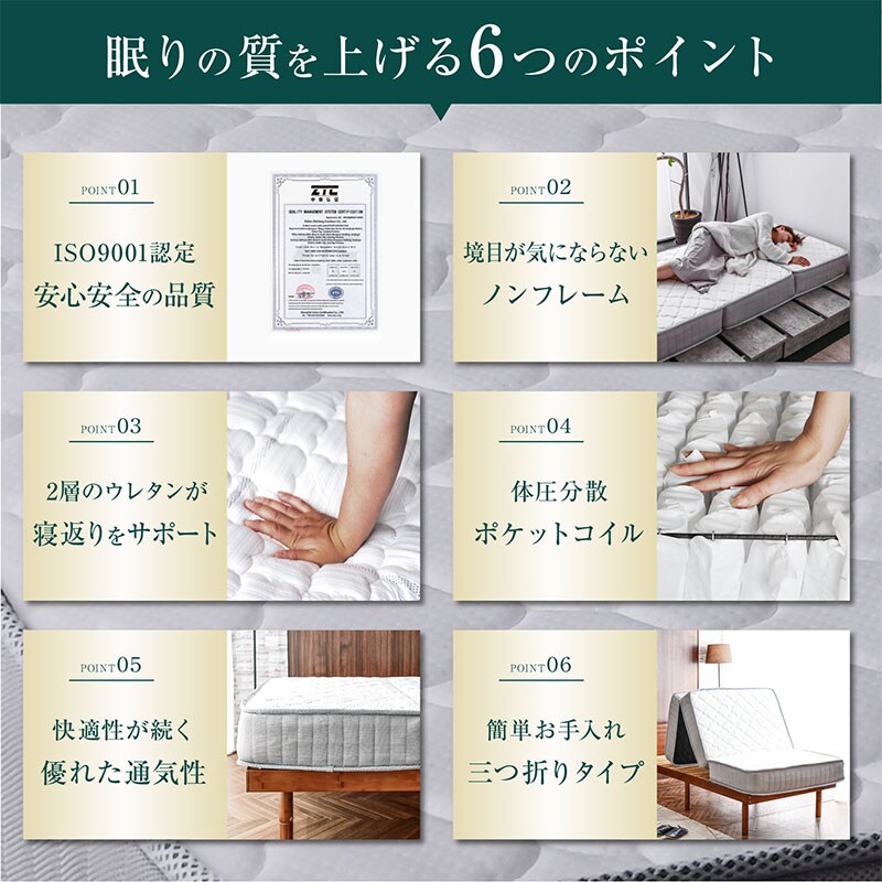 | 特徴 | 【輸入品】 ・身体を点で支え、体圧分散に優れた三つ折りポケットコイルマットレス ・理想的な寝姿勢を作る、快適な寝心地 ・耐久性、通気性に優れた並行配列コイル ・ISO9001認定工場で生産した安心の品質 ・マットレスのフレーム部分を取り外し継ぎ目が気にならない寝心地 ・反発力や強度に優れたコイルスプリングを採用 ・マットレス全体の通気性・耐久性にこだわり |