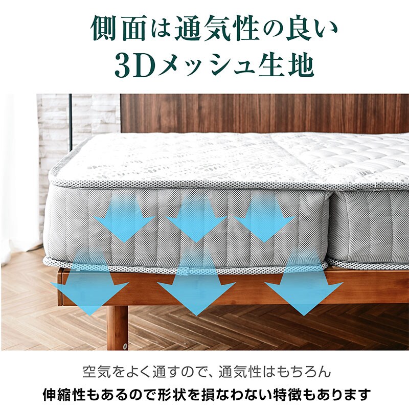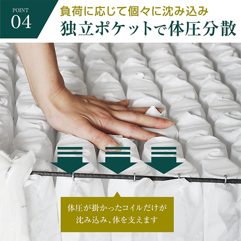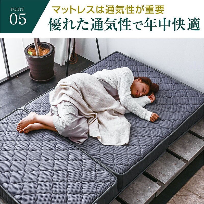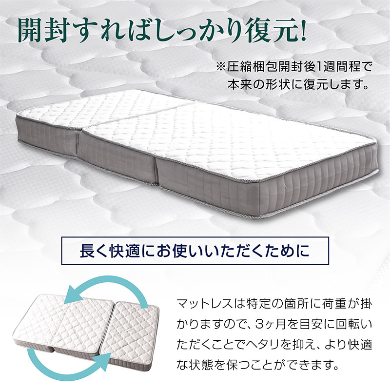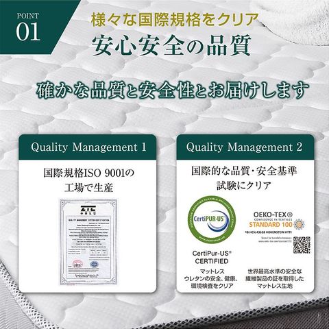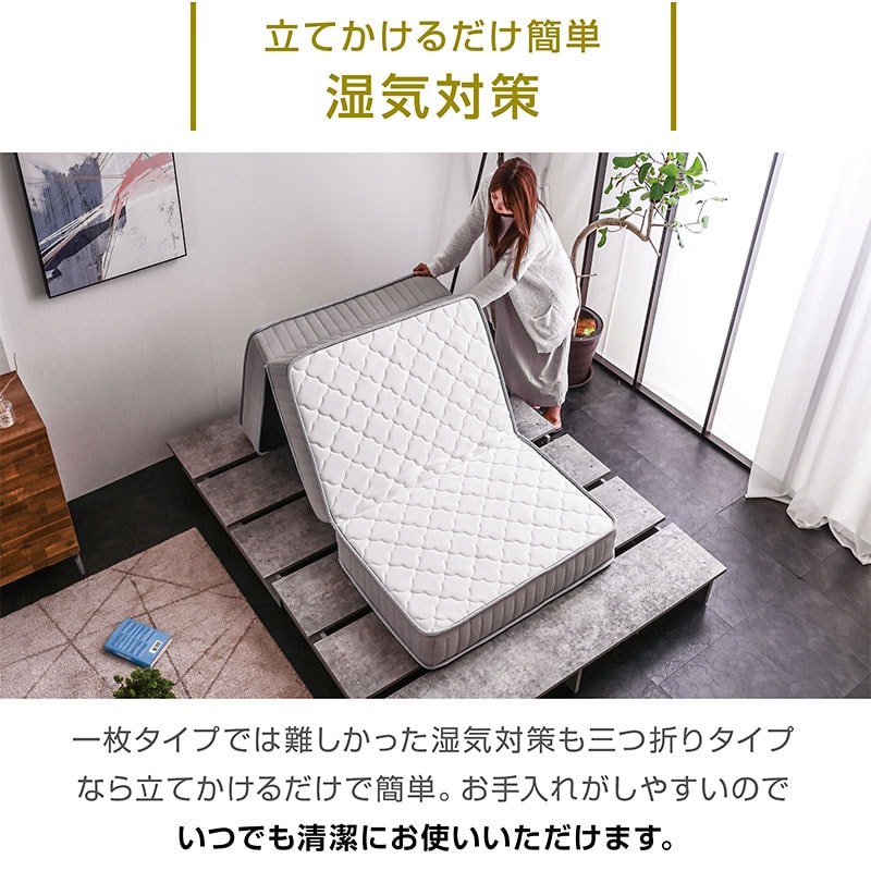 | 特徴 | 【輸入品】 ・身体を点で支え、体圧分散に優れた三つ折りポケットコイルマットレス ・理想的な寝姿勢を作る、快適な寝心地 ・耐久性、通気性に優れた並行配列コイル ・ISO9001認定工場で生産した安心の品質 ・マットレスのフレーム部分を取り外し継ぎ目が気にならない寝心地 ・反発力や強度に優れたコイルスプリングを採用 ・マットレス全体の通気性・耐久性にこだわり |
