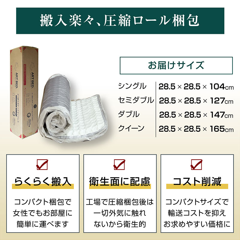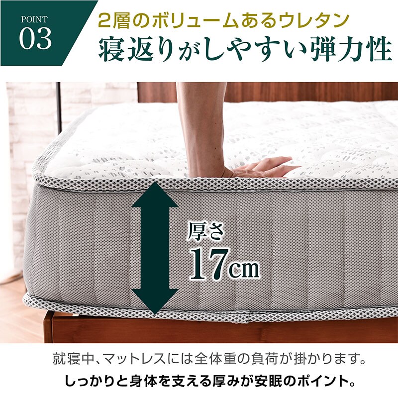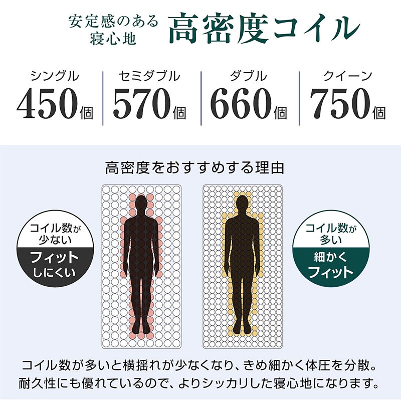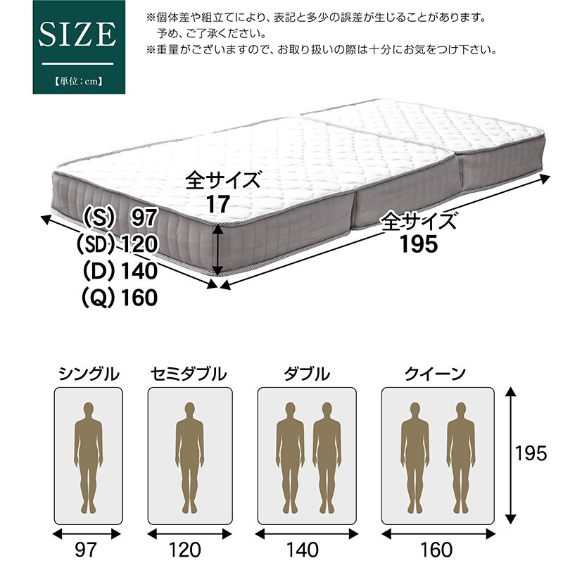 | サイズ(cm) | シングルサイズ:幅97×奥行195×高さ17 セミダブルサイズ:幅120×奥行195×高さ17 ダブルサイズ:幅140×奥行195×高さ17 クイーンサイズ:幅160×奥行195×高さ17 |