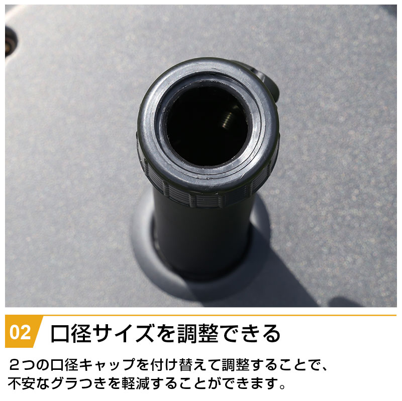 | 特徴 | ・すっきりとしたシンプルデザイン ・口径サイズを調節できる ・ボルトを締めてしっかり固定 ・アクリル樹脂塗装はお手入れカンタン |