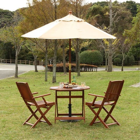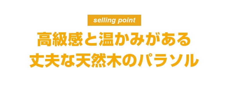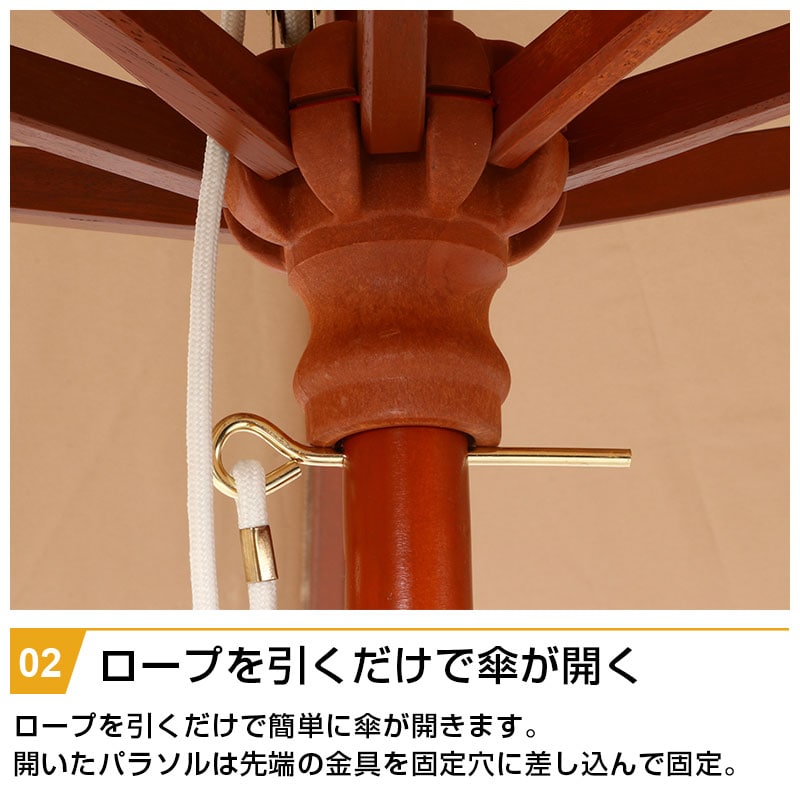 | 特徴 | ・温かみのある天然木を使用したシンプルデザイン ・UVカット率は99.9% ・ロープを引くだけで傘が開く ・開き具合を3段階で調節 ・簡単に閉じて片付けが楽 ・天然木の支柱は強度が高く高品質 |