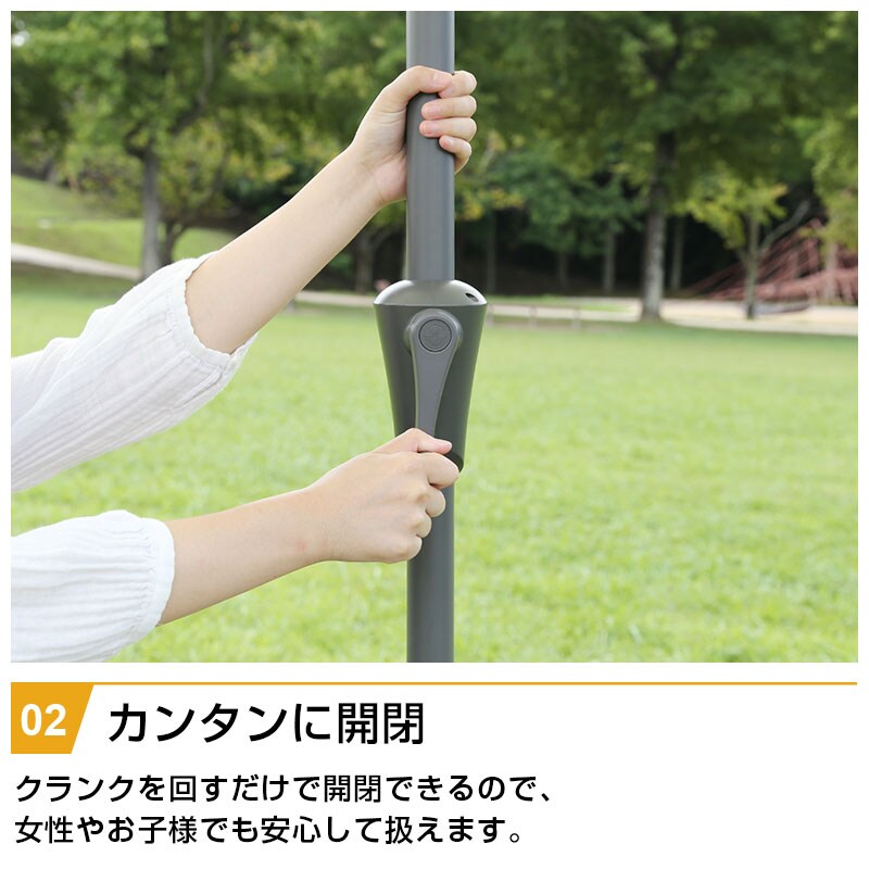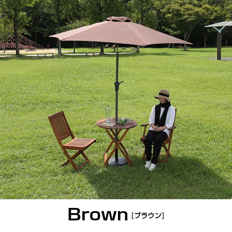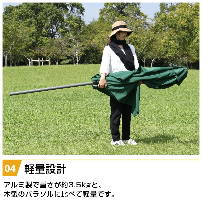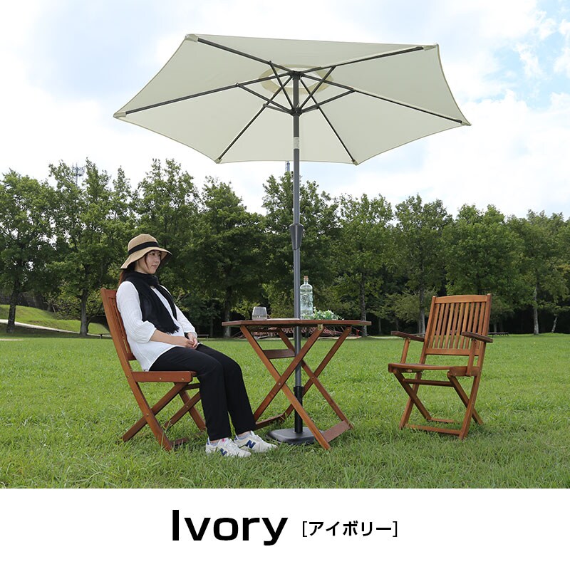 | 特徴 | ・温かみのある天然木を使用したシンプルデザイン ・UVカット率は99.5% ・クランクを回すだけで開閉 ・チルト機能を搭載 ・木製のパラソルに比べて軽量 アルミ支柱は強度が高く、風が強い日でも安心 |