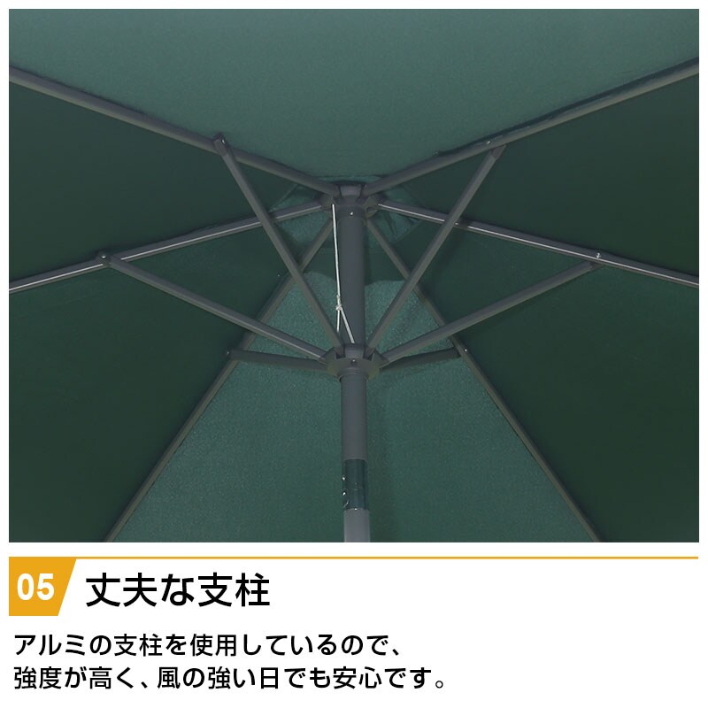 | 材質 | 構造部材:アルミニウム(支柱グレー) 傘生地:ポリエステル200g/m2 |