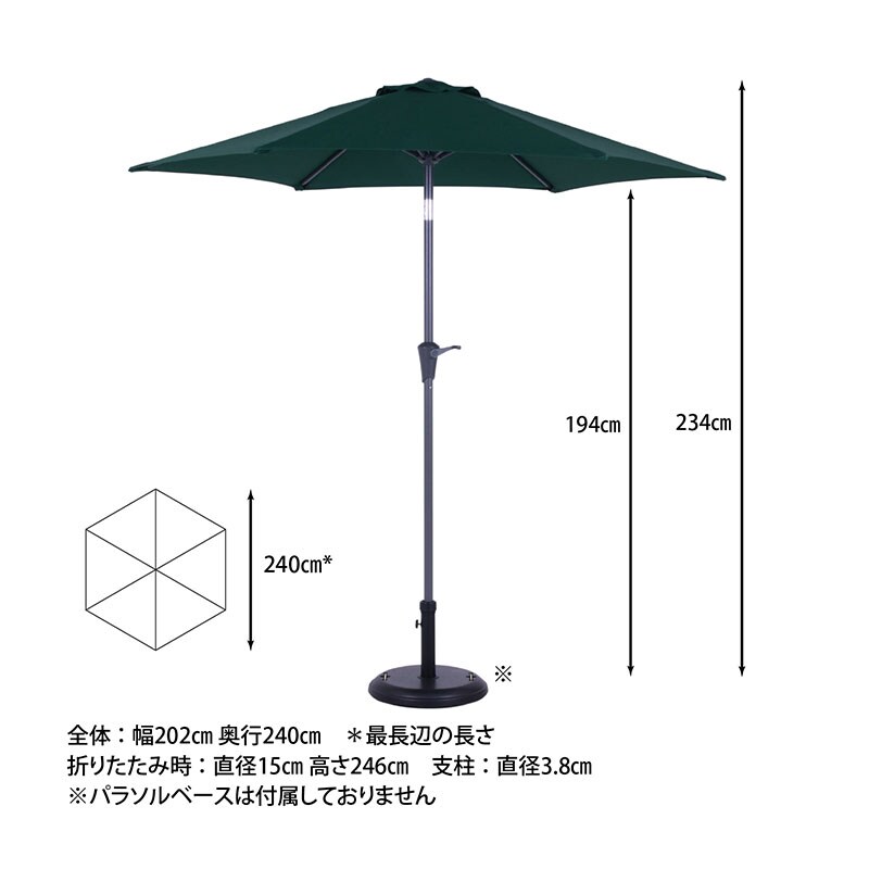 | サイズ(cm) | 幅202×奥行240×高さ234 親骨の長さ:122 展開時最長辺サイズ:約240 支柱径:φ38mm |