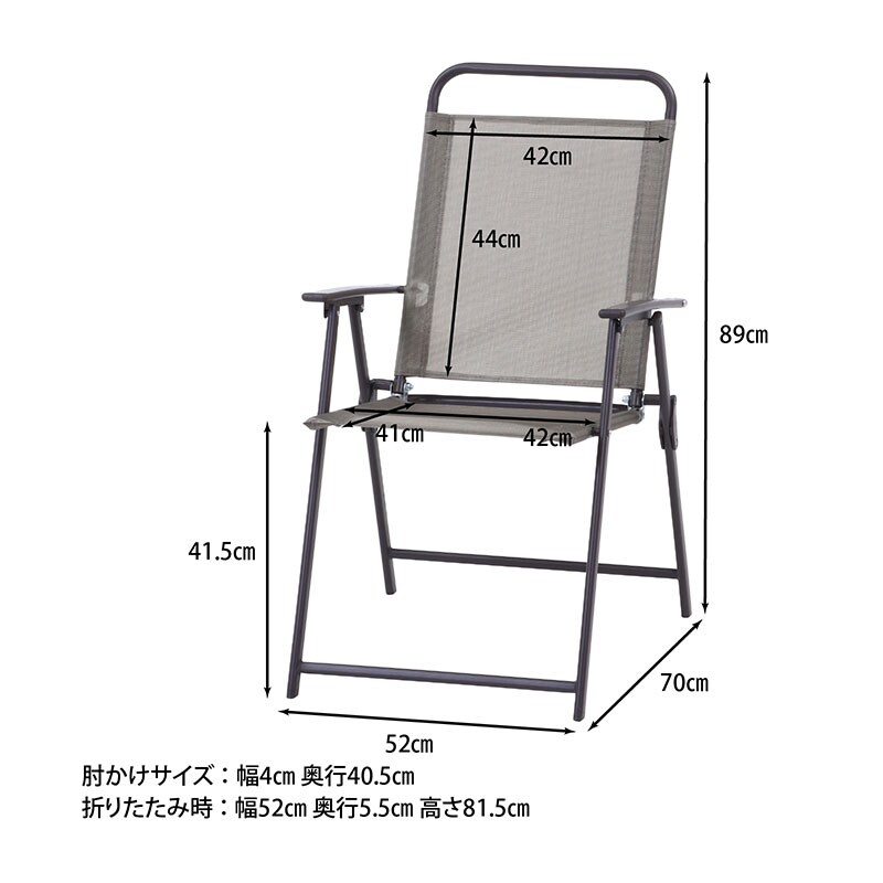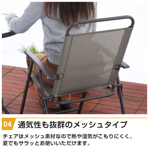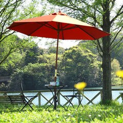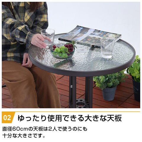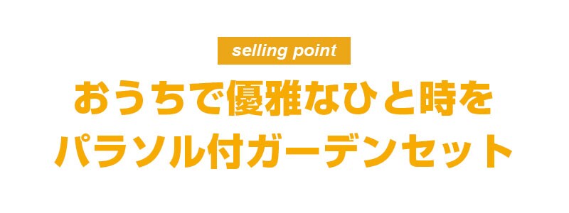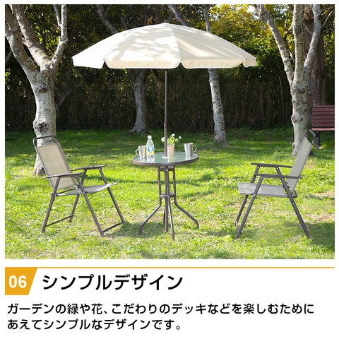 | サイズ(cm) | 【テーブル】 幅60×奥行60×高さ69.5 【チェア】 幅52×奥行70×高さ89(座面高さ41.5) 【パラソル】 φ180×180 耐荷重(テーブル天板):10kg 耐荷重(チェア座面):120kg |