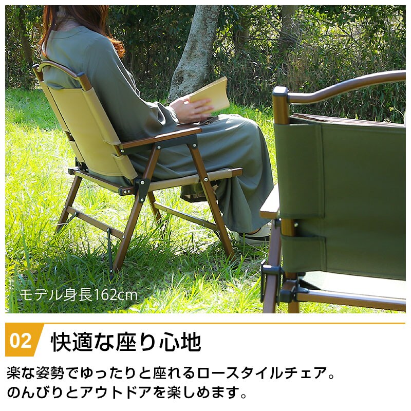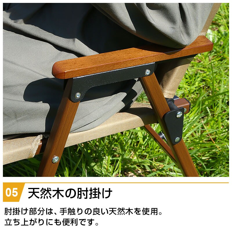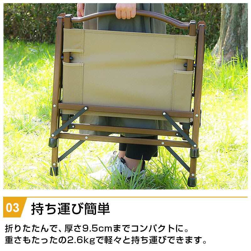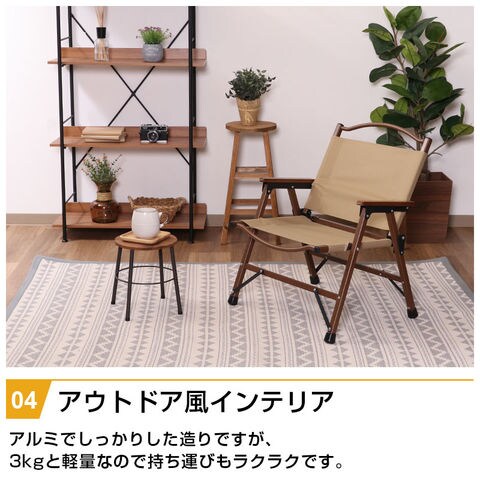 | 特徴 | ・インテリアのアクセントになるアウトドア風インテリア ・楽な姿勢でゆったりと座れるロースタイルチェア ・折りたたんで厚さ9.5cmまでコンパクトに ・重さ2.6kgと軽々と持ち運びできる ・手触りの良い天然木の肘掛け ・汚れても水洗いができ、お手入れ簡単 |