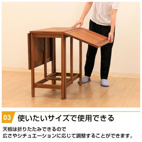 | 特徴 | ・木のぬくもりを感じられるデザイン ・4人でもゆったり使える広々とした天板 ・使いたいサイズで使用できる ・折りたたんだテーブルにチェア4脚をすべて収納 ・直径5cmのパラソルホール付き |