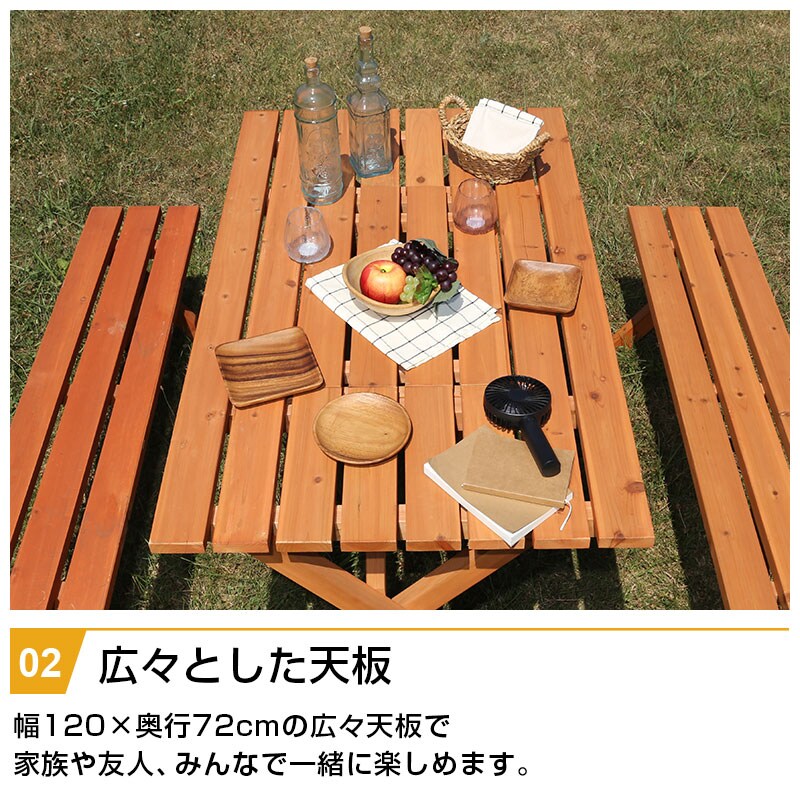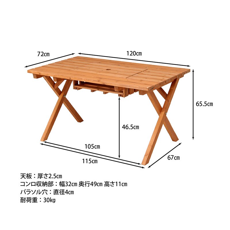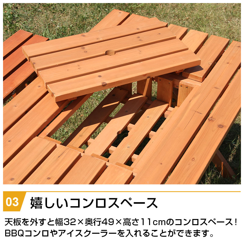| 特徴 | ・木のぬくもりを感じられるデザイン ・みんなで一緒に楽しめる広々とした天板 ・天板を外すと嬉しいコンロスペース! ・軽量設計 ・直径4cmのパラソルホール付き |