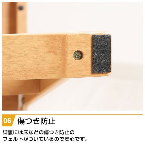 | 特徴 | ・ナチュラルカラーがお部屋に馴染む ・安定する足置きとテーブル付き ・ずり落ち防止のベルトで安心 ・折りたたむと厚さ20cmとコンパクト ・脚裏には床などの傷つき防止のフェルト付き |
