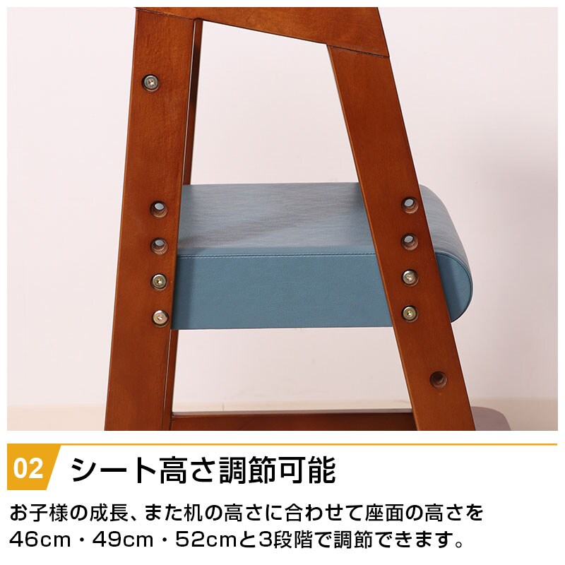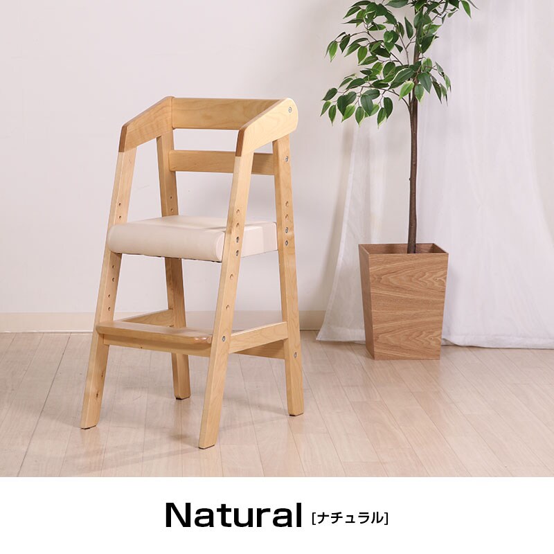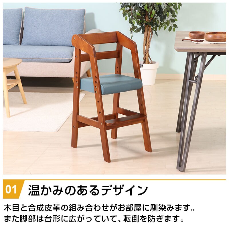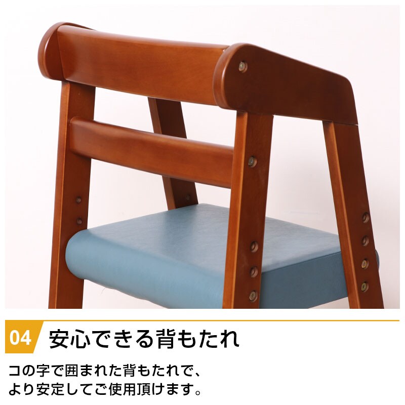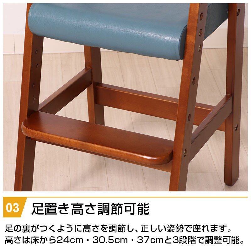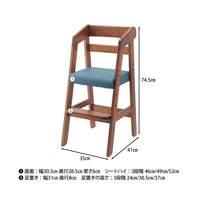 | 特徴 | ・木目と合成皮革の組み合わせが部屋に馴染む ・脚部は台形に広がっていて転倒防止 ・お子様の成長や座面の高さにあわせて座面の高さを3段階調節 ・足置き高さ3段階調節 ・安定して使用できるコの字に囲まれた背もたれ |