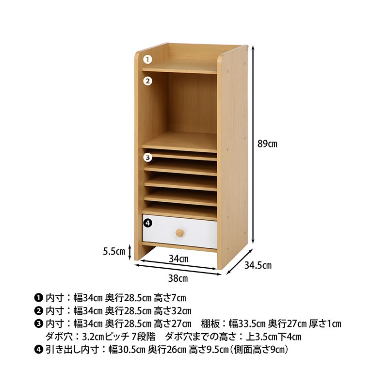 | サイズ(cm) | 幅38×奥行34.5×高さ89 耐荷重(全体):20kg 引出内寸:30.5×26×9.5 |