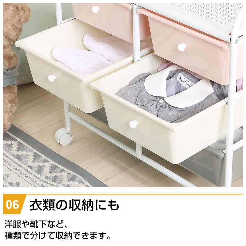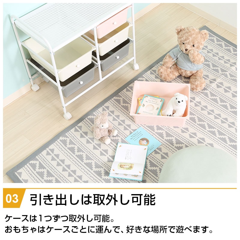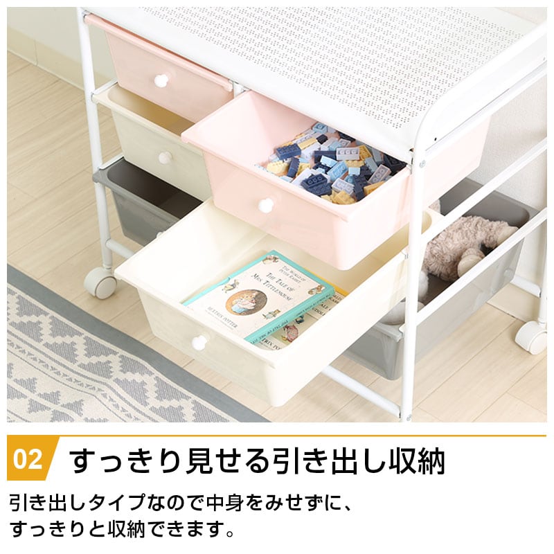 | 特徴 | ・バスケットの傾きで中身がわかるのでお部屋の片付けが簡単 ・すっきり見せる引き出し収納 ・引き出しは取り外し可能 ・キャスター付きで移動はらくらく ・安全のストッパー付き |