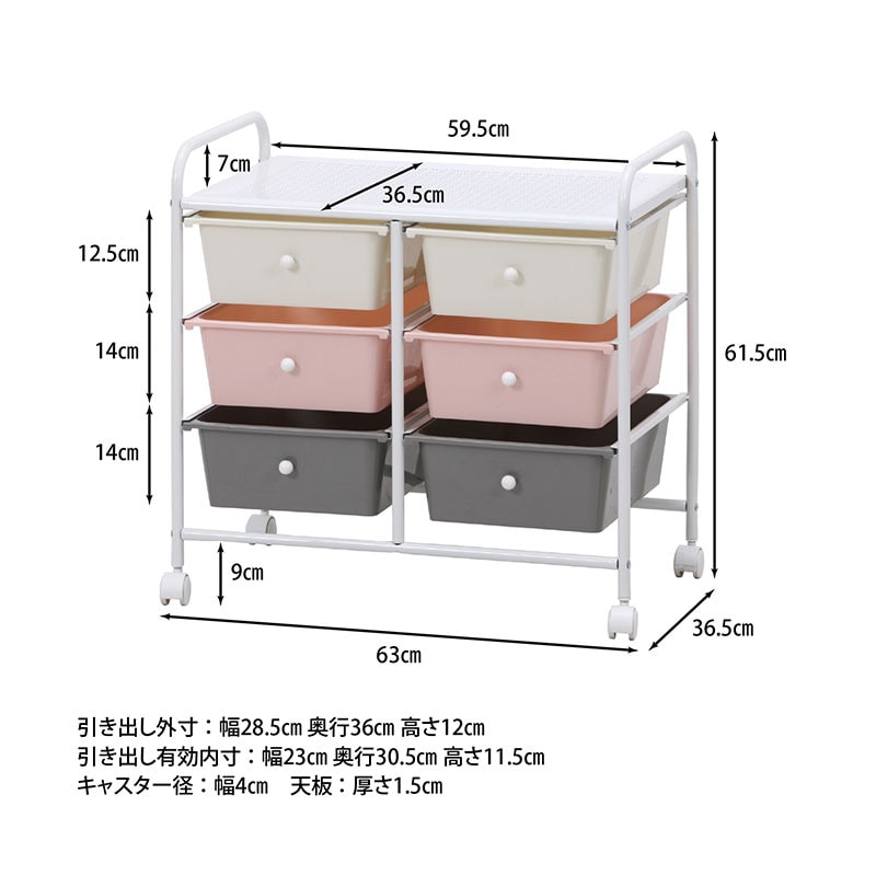 | サイズ(cm) | 幅63×奥行36.5×高さ61.5 耐荷重(全体):10kg 耐荷重(天板):5kg 耐荷重(収納):2kg/1つ当たり 引出内寸:28.5×36×12 |
