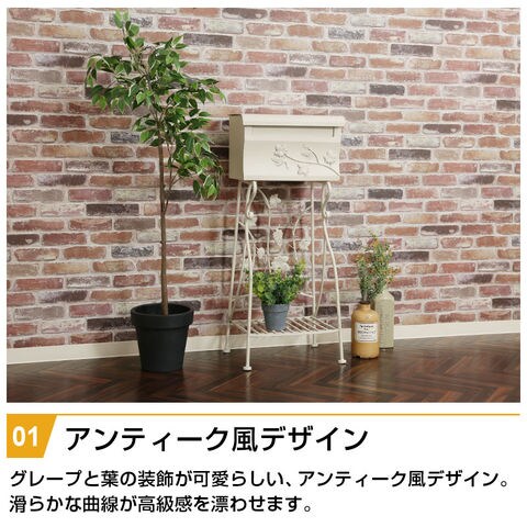 | 特徴 | ・グレープの葉の装飾が可愛らしい、アンティーク風デザイン ・A4サイズの封筒やメール便も受取可能な投函口 ・上部が大きく開閉するので取り出しスムーズ ・サイドの通し穴に南京錠も付けられる ・お花やグリーンを飾れる便利な棚付き |