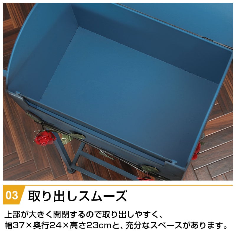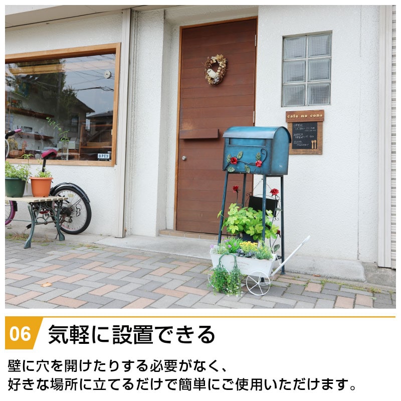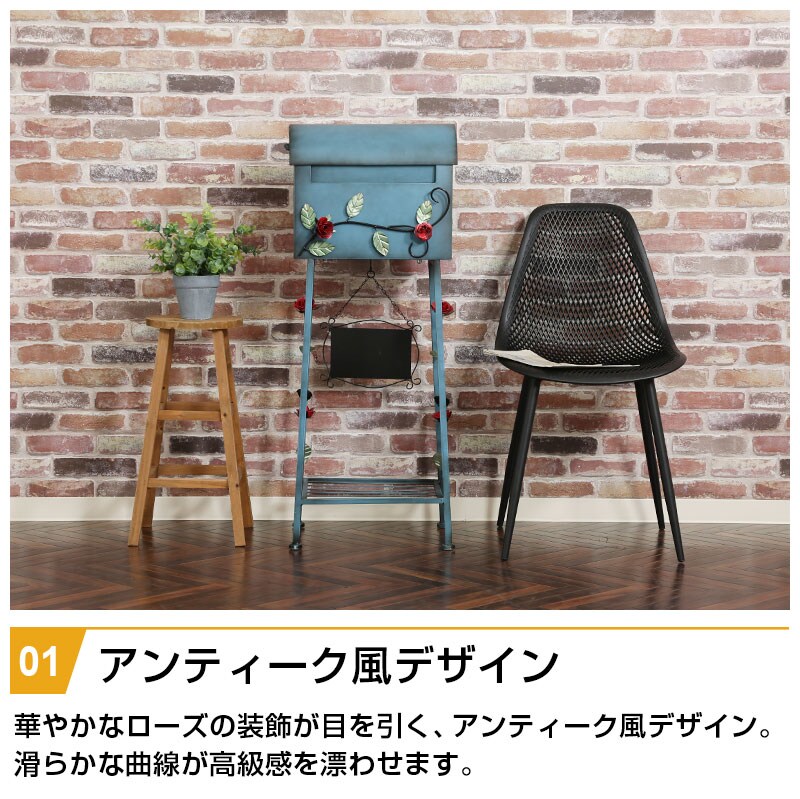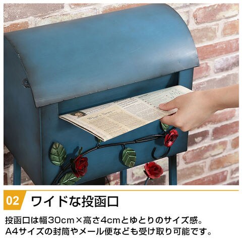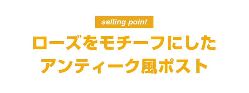 | 特徴 | ・バラの装飾が可愛らしい、アンティーク風デザイン ・A4サイズの封筒やメール便も受取可能な投函口 ・上部が大きく開閉するので取り出しスムーズ ・サイドの通し穴に南京錠も付けられる ・お花やグリーンを飾れる便利な棚付き |