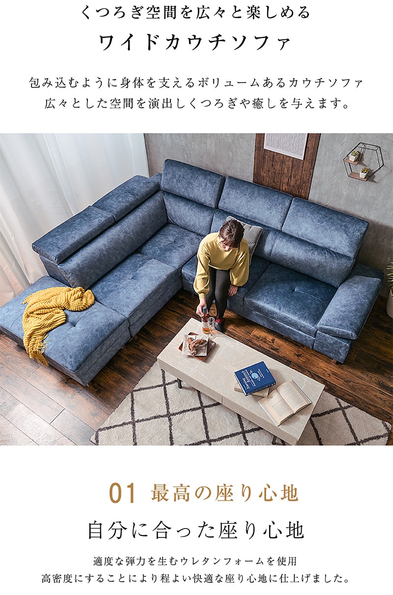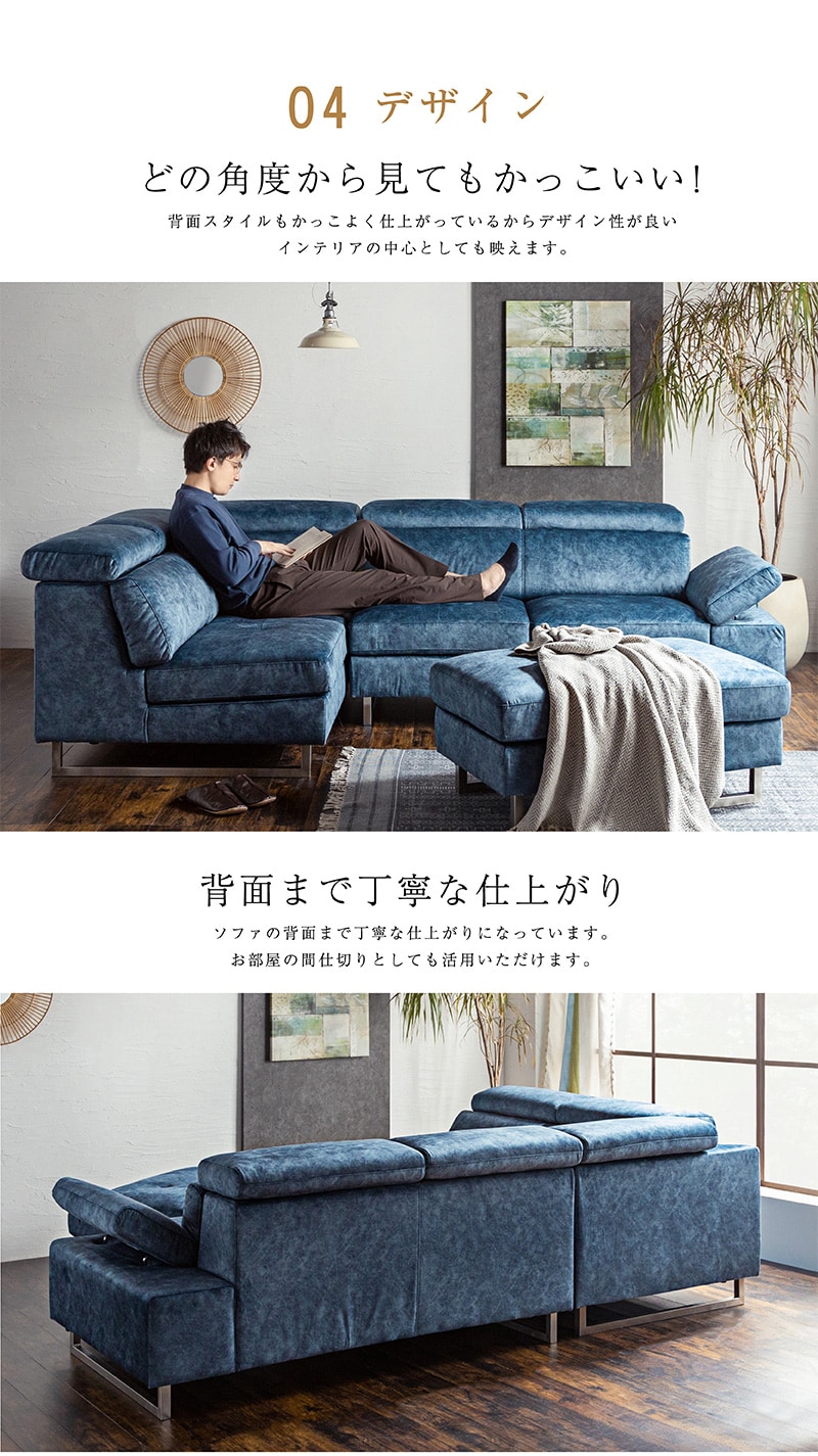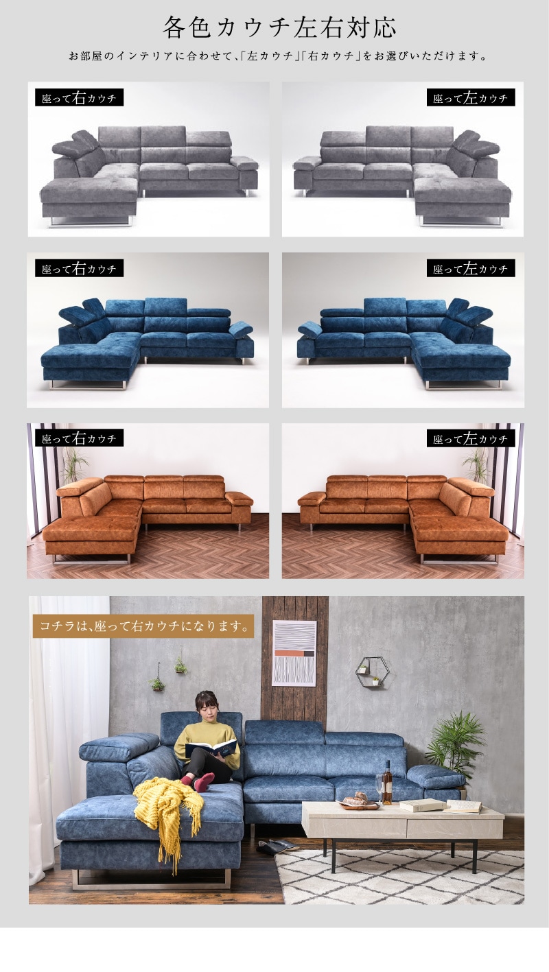 | 特徴 | ハイバック対応のコーナーカウチ。濃淡を生かしたスウェード調の生地 人気の新素材スムーステックを使用したカウチソファーです。 ヘッドレスト、アーム部分は可変ギア仕様でハイバックやローバックに対応。 脚を取ればローソフアにもなる 座面内部はウレタンフォーム、S字スプリング、ウェービングベルトで長時間座っても 疲れにくく快適な座り心地です。 好みや状況に合わせて可動できるので、ダイニングからの視界を妨げる事もありません。 |