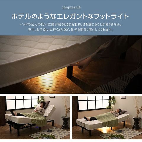 \設定時間に自動でベッドが起き上がる!/ スマホで簡単設定 電動アシストベッド ・無段階調節可能な静音2モーター仕様 ・お好みの角度を記憶、ボタン1つで自動セッティング ・専用リモコン、スマホ 選べる2つの操作方法 ・体圧分散性に優れたポケットコイルマットレス採用 ・マットレスはグレー色なので汚れが目立ちにくい ・ホテルのようなエレガントなフットライト ・ドイツ製モーター採用(OKIN社製) ・ベッド下はお掃除ロボットが入る十分なスペース ・ベッド左右にUSBポート付き |