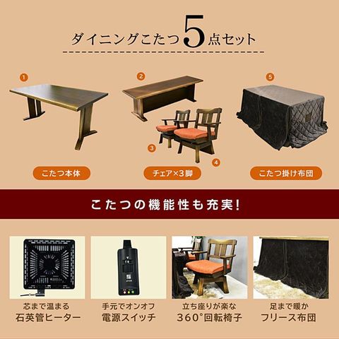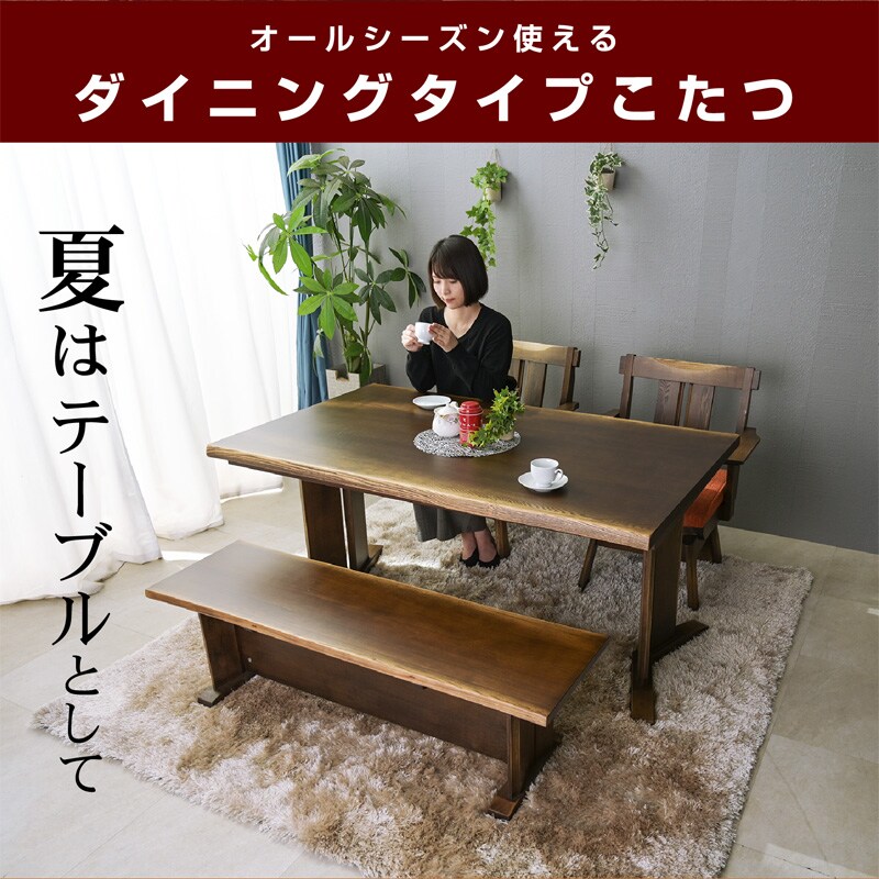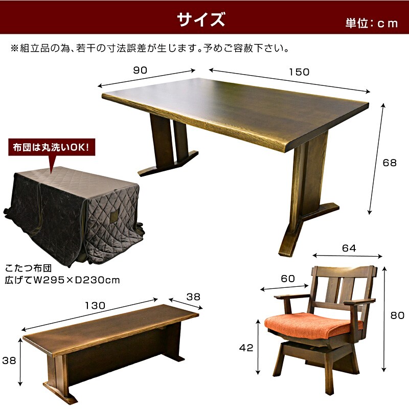 | サイズ(cm) | 【テーブル】幅150×奥90×高68 【チェア】回転いす:幅64×奥60×高80(SH42) ベンチ:幅130×奥38×高38 【こたつ掛け布団】約295×約230 |