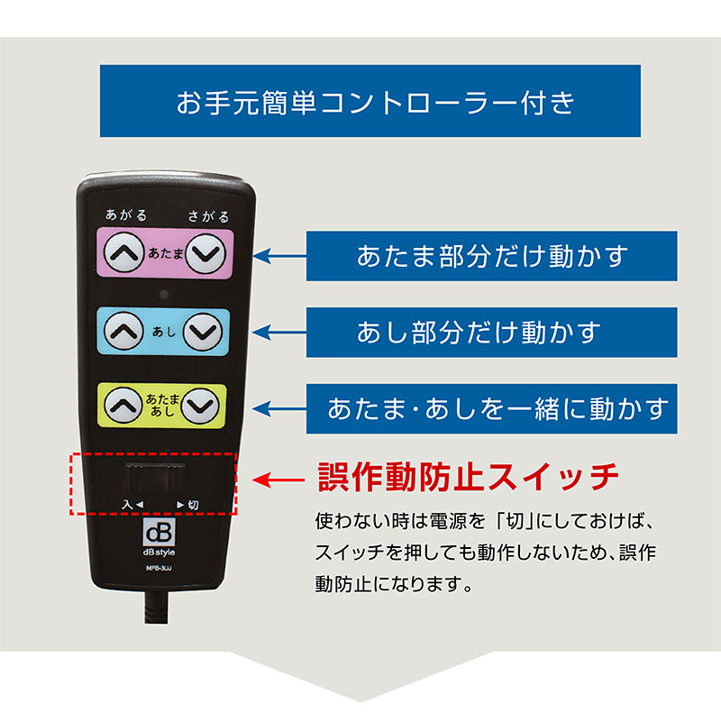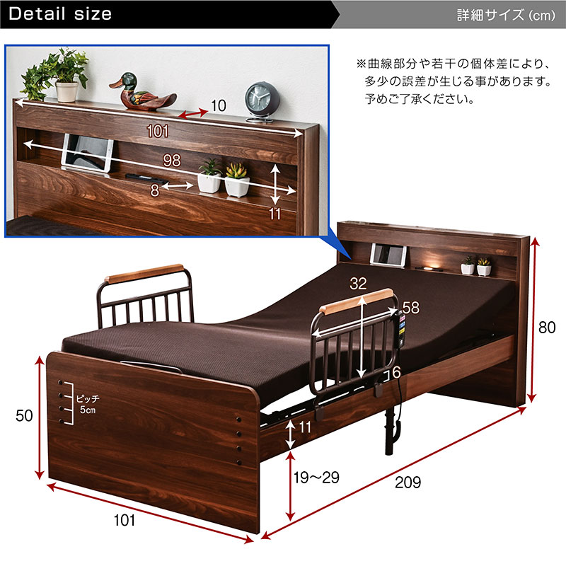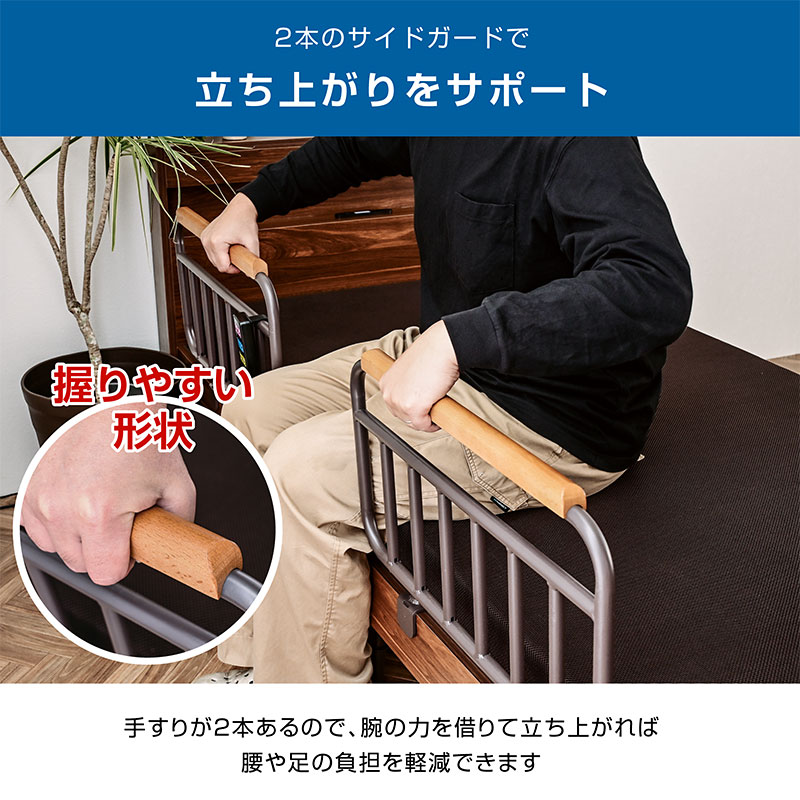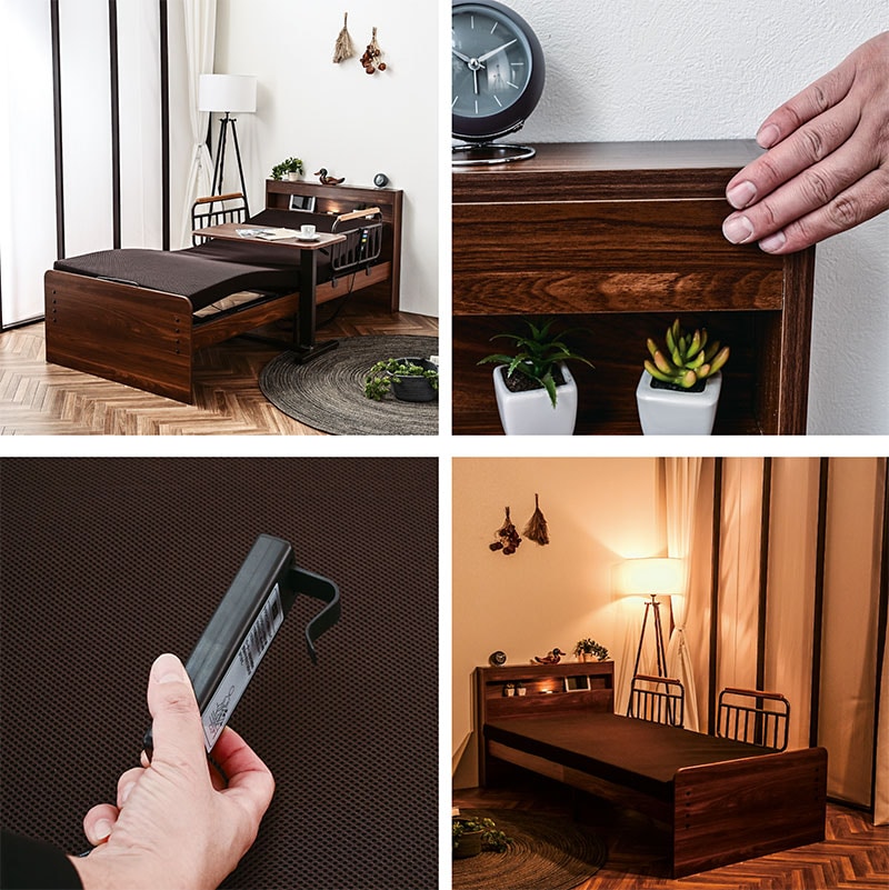 ・2モーター式電動ベッド(背上げ独立+脚上げ独立) ・小物置きに便利な宮棚 ・中央にLED照明 ・充電に便利なコンセント付き ・お手元コントローラー付き(誤作動防止スイッチあり) ・使う人に合わせやすい床板の高さ調節3段階可能 ・取り外して移動ができる2つのサイドガード ・握りやすい形状のサイドガードは立ち上がりをサポート ・品質にこだわった安心の国内生産マットレス ・マットレスは汚れても目立ちにくい色 ・復元率95%の硬質ウレタン素材でふかふか ・カバーは取り外し&洗濯可能 |