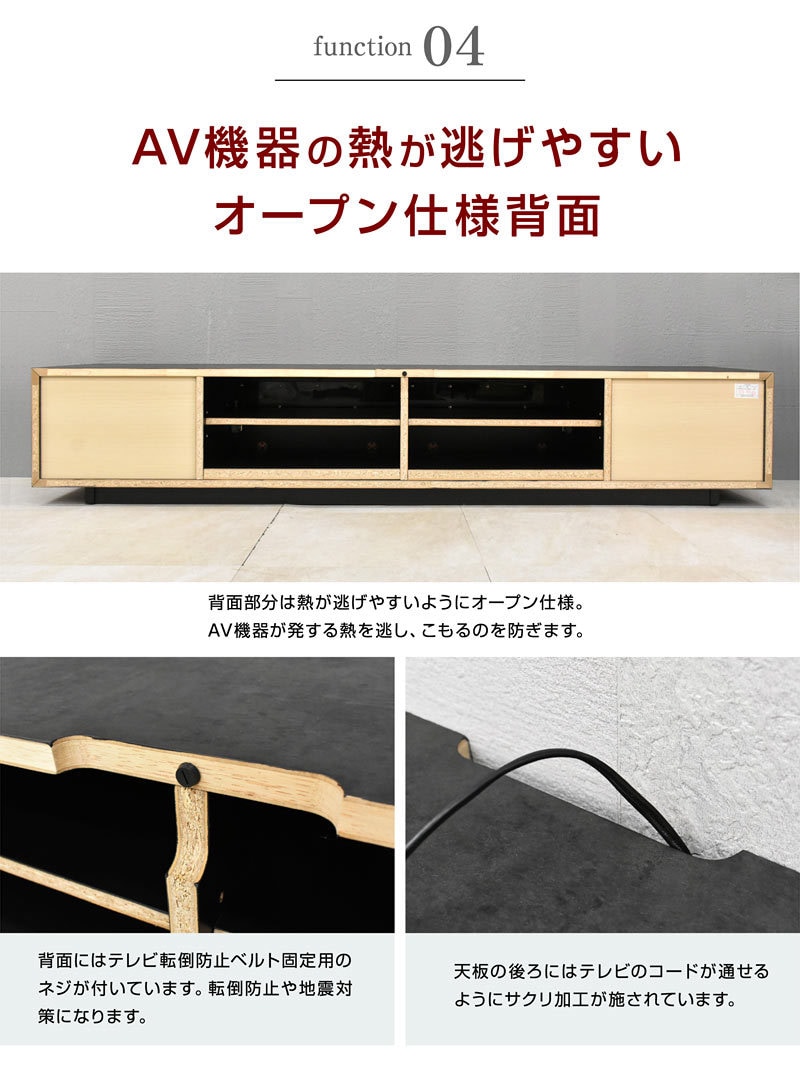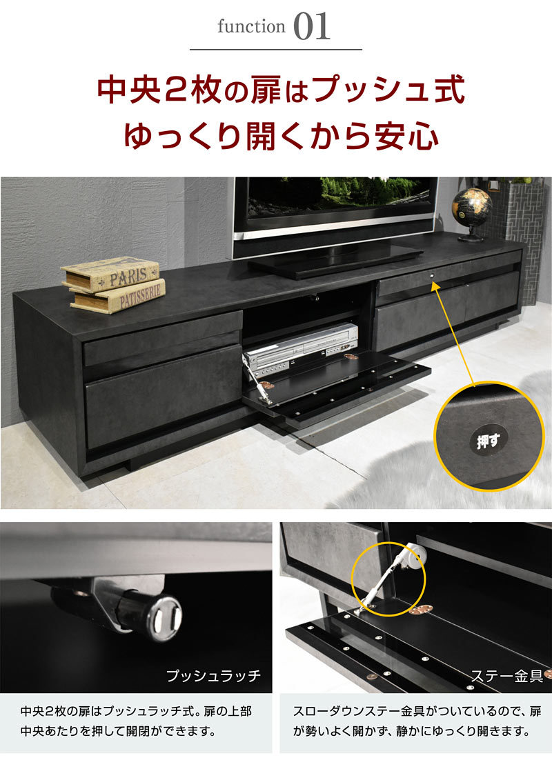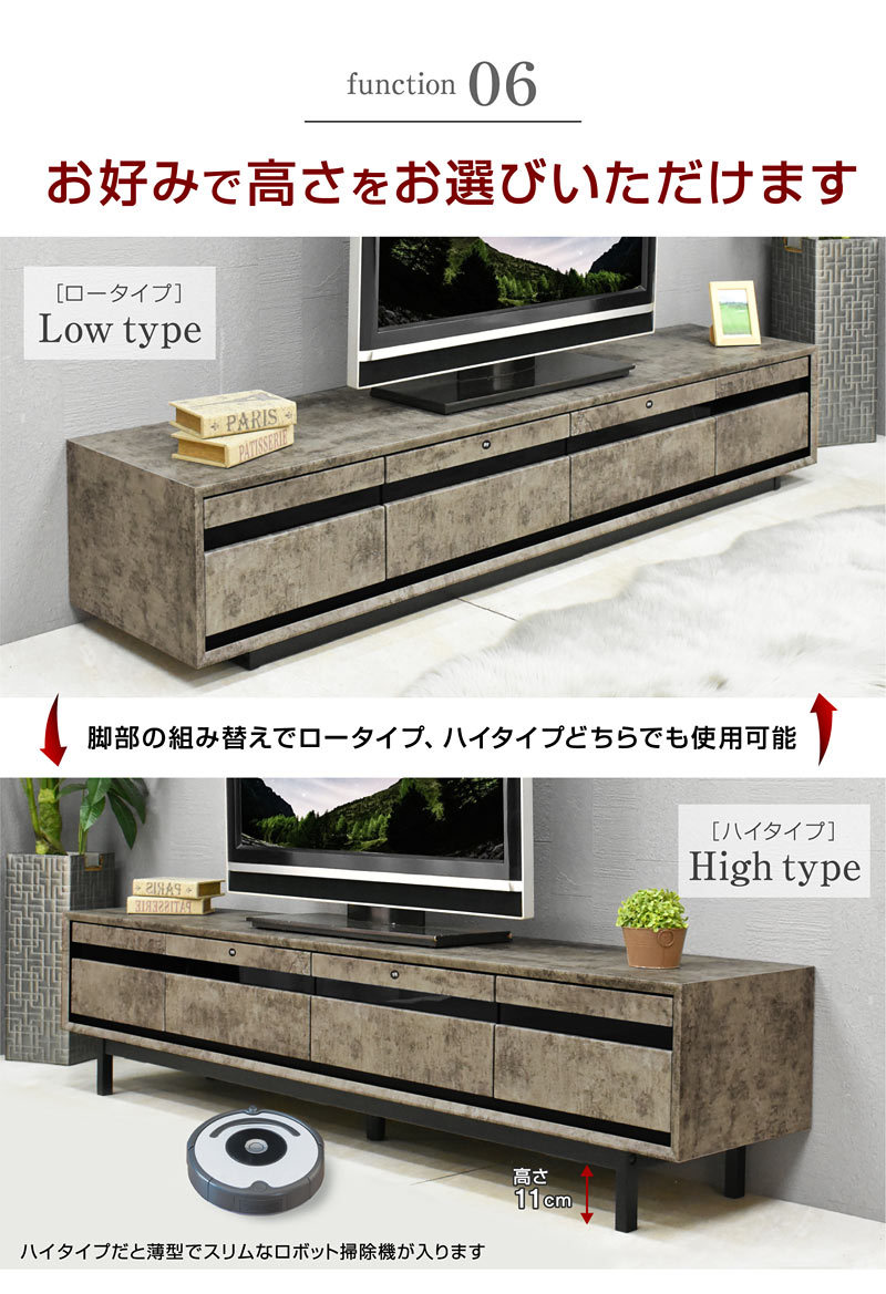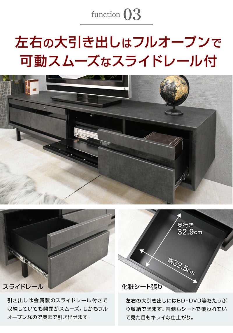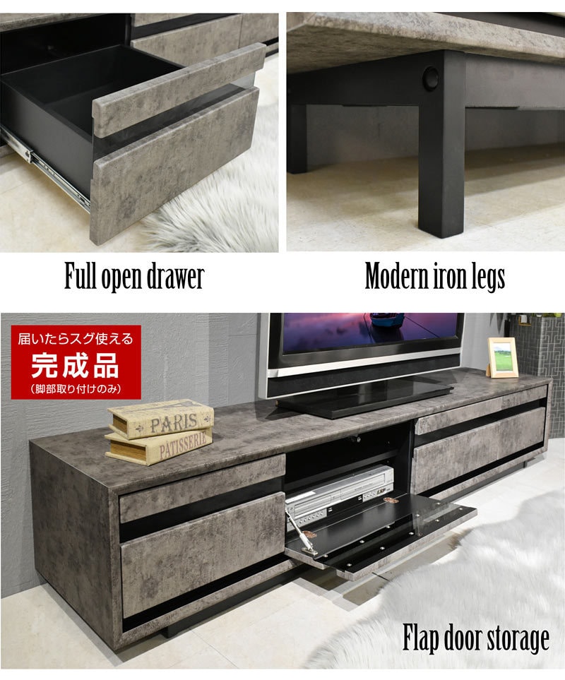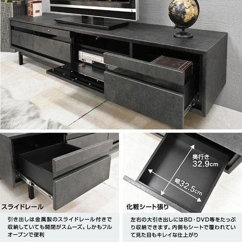 | 特徴 | 【ほぼ完成品(脚の取り付け必要)】 ・ワイドサイズだから大きめなテレビを置いても大丈夫 ・センスのいいスタイリッシュTVボード ・AV機器が2台収納できる ・DVDやCD等の収納に便利な大引き出し2杯 ・背面にはコードが通せる加工 ・お好みでハイタイプ、ロータイプお選びいただけます |