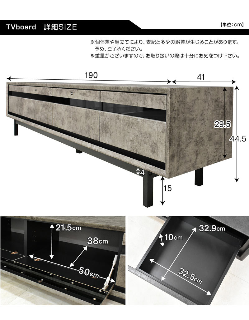 | サイズ | Wide190サイズ:幅190×奥41×高33.5〜44.5(cm) デッキ部:幅32.5×奥32.9×高10(cm) 引き出し部:幅50×奥38×高21.5(cm) |