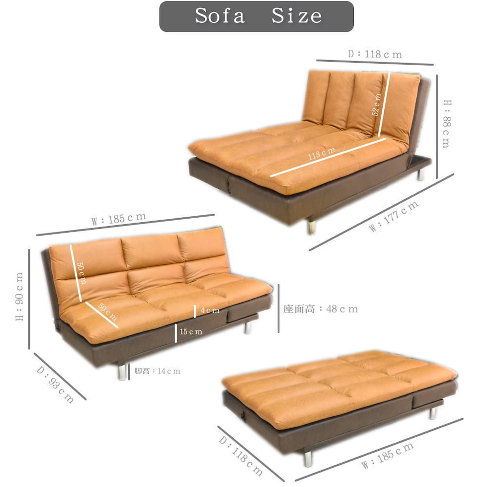 ソファ時:幅185×高さ90×奥行93(cm) 座面高さ48(cm) カウチ時:幅177×高さ88×奥行118(cm) 座面高さ48(cm) ベッド時:幅185×高さ48×奥行118(cm) 座面高さ48(cm) |
