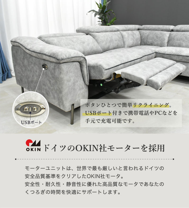 | 特徴 | ライトグレー色の電動カウチソファです。 右肘ソファのみの電動リクライニングソファになります。 ボタンひとつで楽々リクライニングが出来ます。 USBポートも付いており手元で携帯電話の充電なども出来ます。 背もたれはシリコンフィル入りでふっくら柔らかです。 座面の内部にはポケットコイル使用でやや硬めの座り心地。 しっかりお尻を包み込んで長時間快適にお過ごし頂けます。 ヘッドレスト多段階ギアでハイバックとローバックの調整が可能です。 脚部は12cmの高さがあり、お掃除ロボットもご使用頂けます。 また、取り外してロータイプでもご使用可能です。 |
