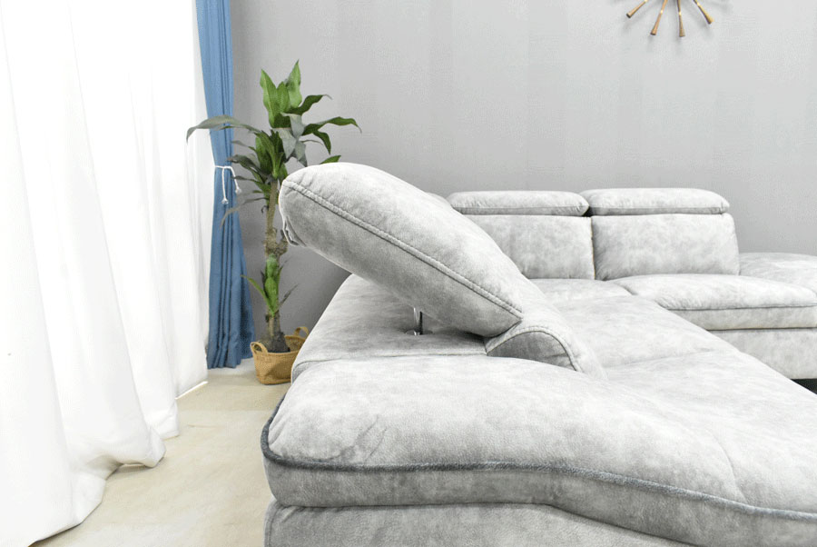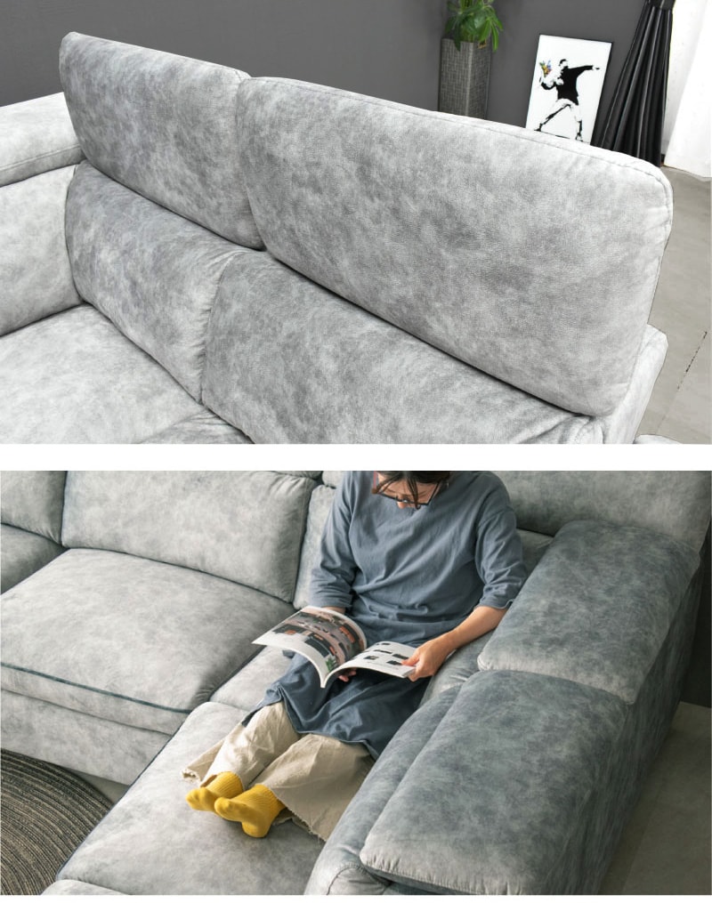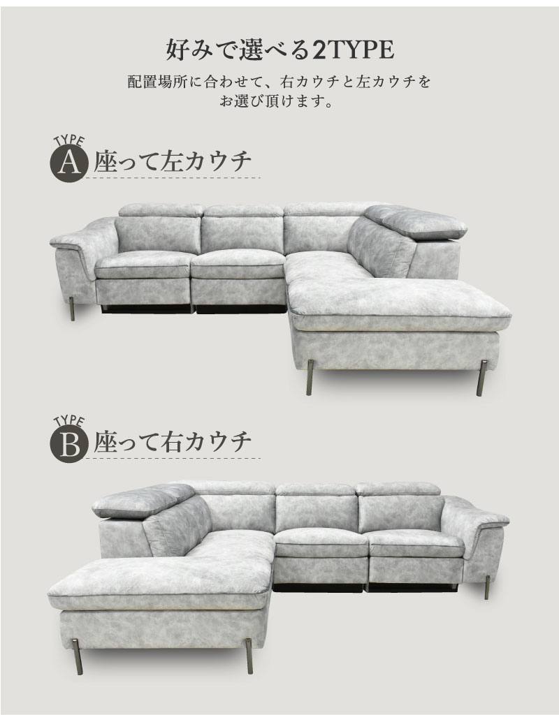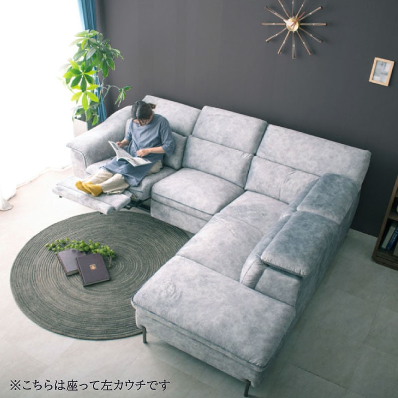 開梱設置付 左右選べる 電動リクライニングソファ ファブリック カウチソファ 可動式ヘッドレスト 3人掛け 大型 高級ソファ Alicia アリシア / ライトグレー / 座って右カウチ / -ART