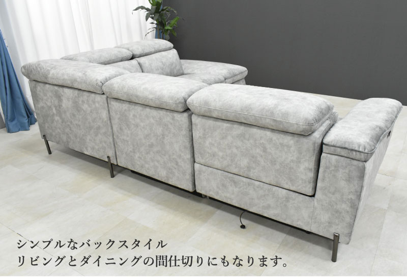 | サイズ | 全体:幅260×高さ80-103×奥行100(cm) 座面高さ48(cm) 電動右肘ソファ:幅95×高さ80-103×奥行100(cm) 座面高さ48(cm) 中央肘無しソファ:幅70×高さ80×奥行100(cm) 座面高さ48(cm) 左カウチソファ:幅95×高さ80×奥行215(cm) 座面高さ48(cm) |