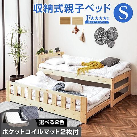親子ベッド 天然木 コンセント付き スライド収納式 二段ベッド 2段ベッド 木製ベッド 子供用ベッド ツインズ / ベッド:ナチュラル / マットレス:グレー / (圧縮三つ折りポケットコイルマット2枚付) -ART