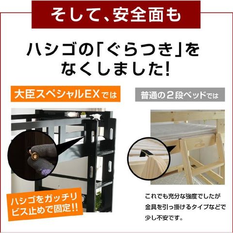 | 特徴 | \アウトレットで激安大特価!/ ・上下段LED照明、スライド式コンセント付き ・垂直はしごでスペースの有効活用が可能 ・上下空間が約1m有り大人でも余裕の出入り ・成人男性5人が乗っても余裕の耐荷重! ・北欧産のパイン無垢材を使用 ・耐震式の上下連結でぐらつきをなくす ・シングルベッド対応 ・社員寮や学生寮・民泊等でもご使用頂けます |