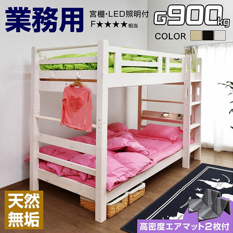 二段ベッド 2段ベッド 天然木 耐荷重900kg 上下空間約1m 大臣スペシャルEX 宮付き LED照明 コンセント 学生 社員寮 下宿 社宅 大人用 / ホワイトウォッシュ / (エアアート マット2枚付) -ART