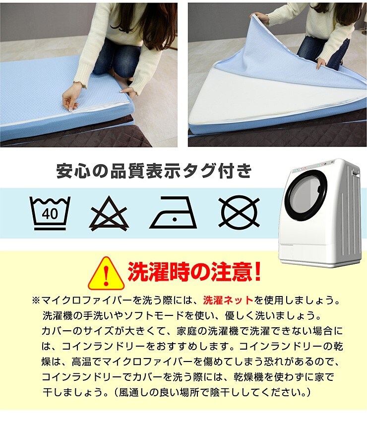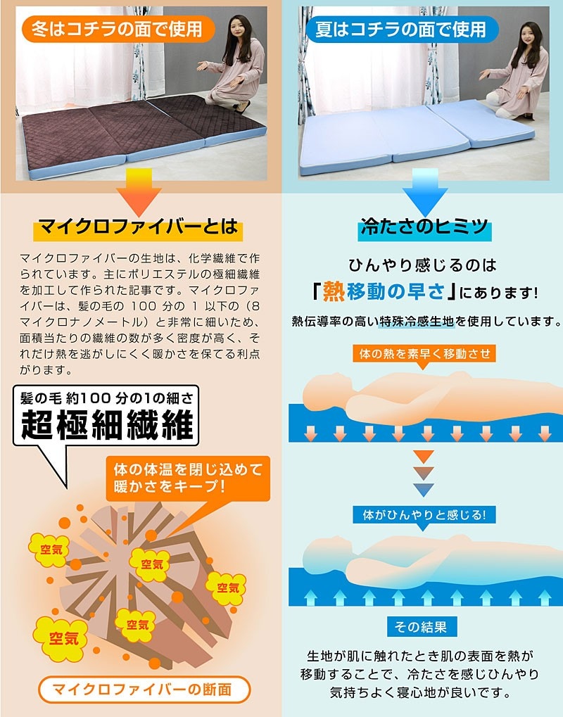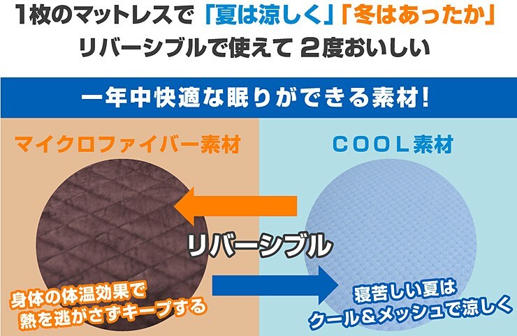 | 特徴 | 【輸入品】 ・リバーシブルでマイクロファイバーで温かい側と クール素材で涼しい側を選択でき1年を通して快適に使えます。 ・カバーは、外して丸洗いOK ・ロール状の梱包で届くのでコンパクト。お部屋への搬入が楽々です ・二段ベッドやシステムベッド等にも最適 ・エコテックス規格にクリアした、人・環境に優しい製品です |