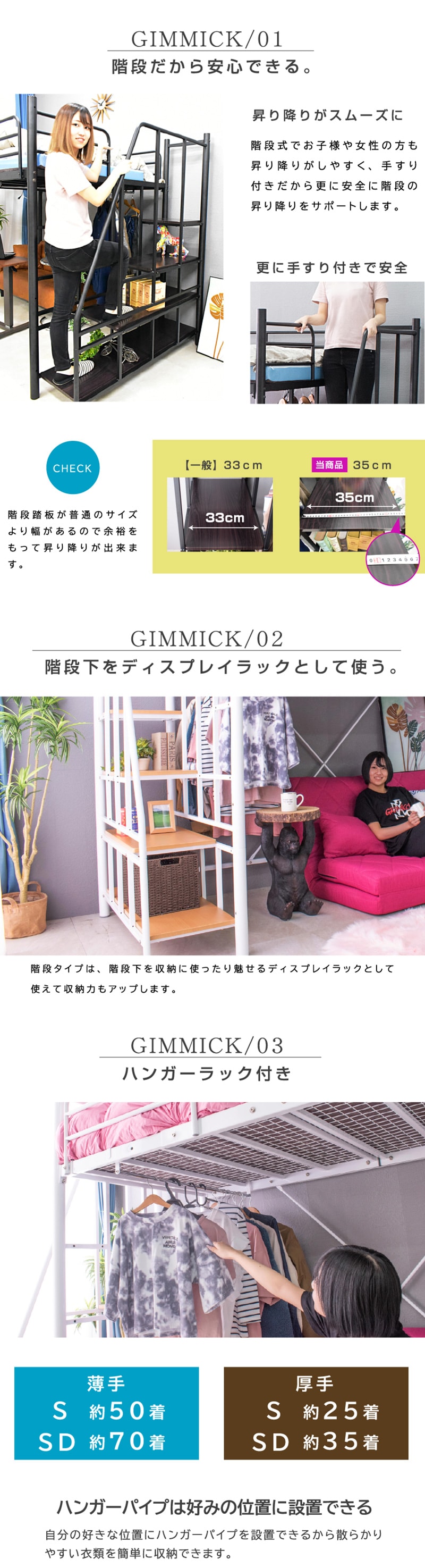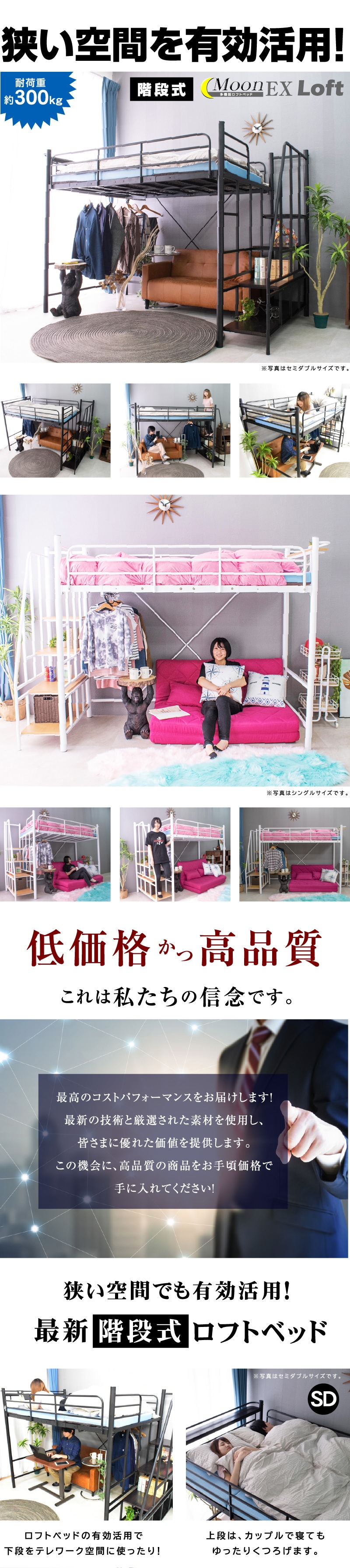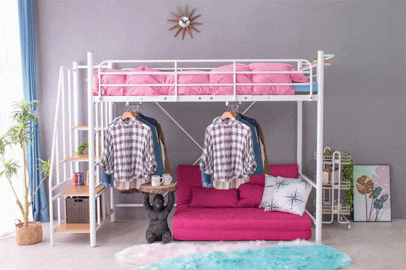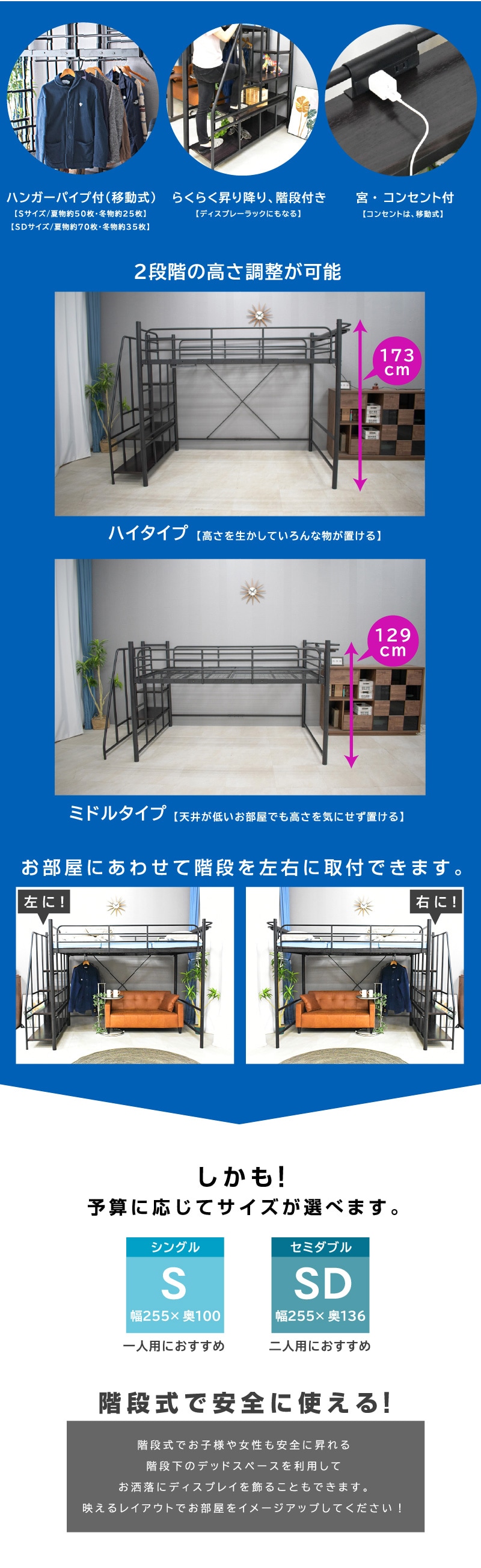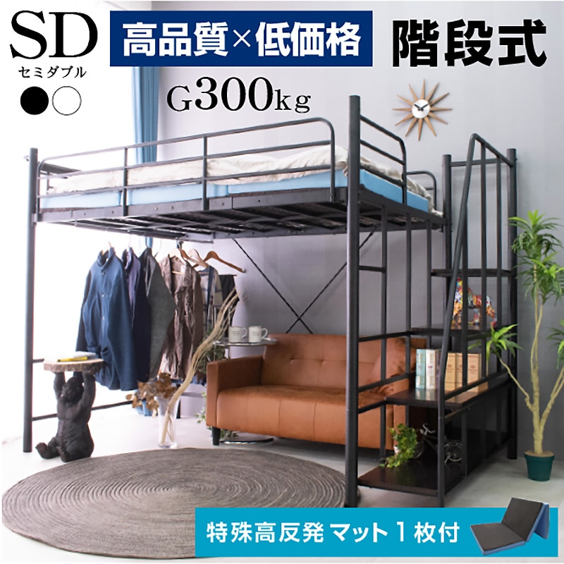 ・ベッド下部が有効に使える高さが嬉しい ・ワンルームや子供部屋など狭い空間でも設置可能 ・自由な大空間を有効活用 ・ハンガーパイプ付きで 【シングル】薄手約50着・厚手約25着 【セミダブル】薄手約70着・厚手約35着掛けられる! ・らくらく昇り降り階段付き ・階段は左右どちらでも取付可能 ・階段下を収納やディスプレイラックとしても使用可能 ・宮・移動式コンセント付き ・嬉しい2段階の高さ調整可能 ・宮棚は簡単取り付け、取り外し自由自在 |