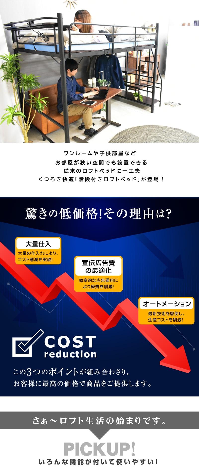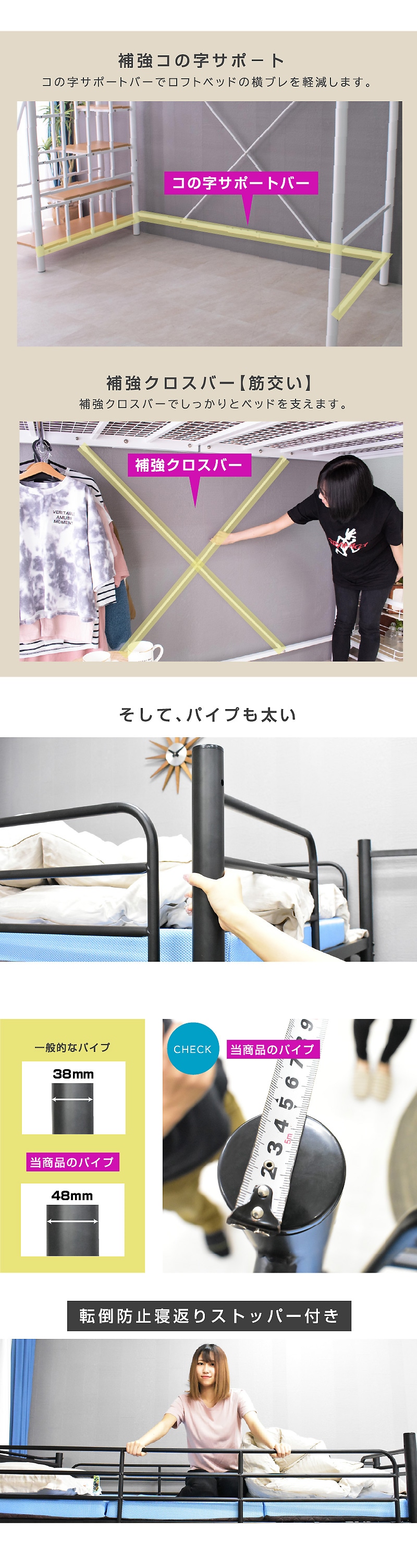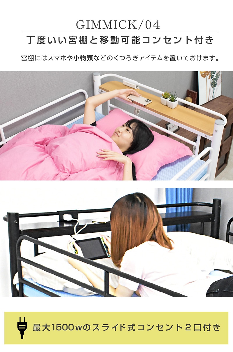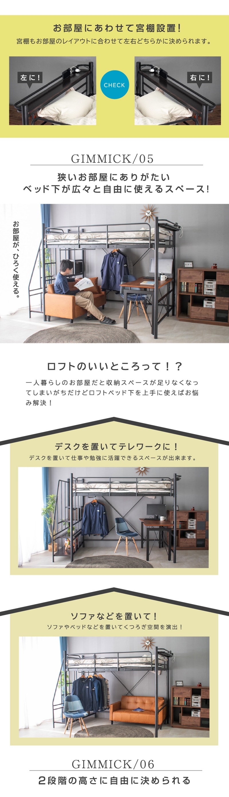 ・ベッド下部が有効に使える高さが嬉しい ・ワンルームや子供部屋など狭い空間でも設置可能 ・自由な大空間を有効活用 ・ハンガーパイプ付きで 【シングル】薄手約50着・厚手約25着 【セミダブル】薄手約70着・厚手約35着掛けられる! ・らくらく昇り降り階段付き ・階段は左右どちらでも取付可能 ・階段下を収納やディスプレイラックとしても使用可能 ・宮・移動式コンセント付き ・嬉しい2段階の高さ調整可能 ・宮棚は簡単取り付け、取り外し自由自在 |