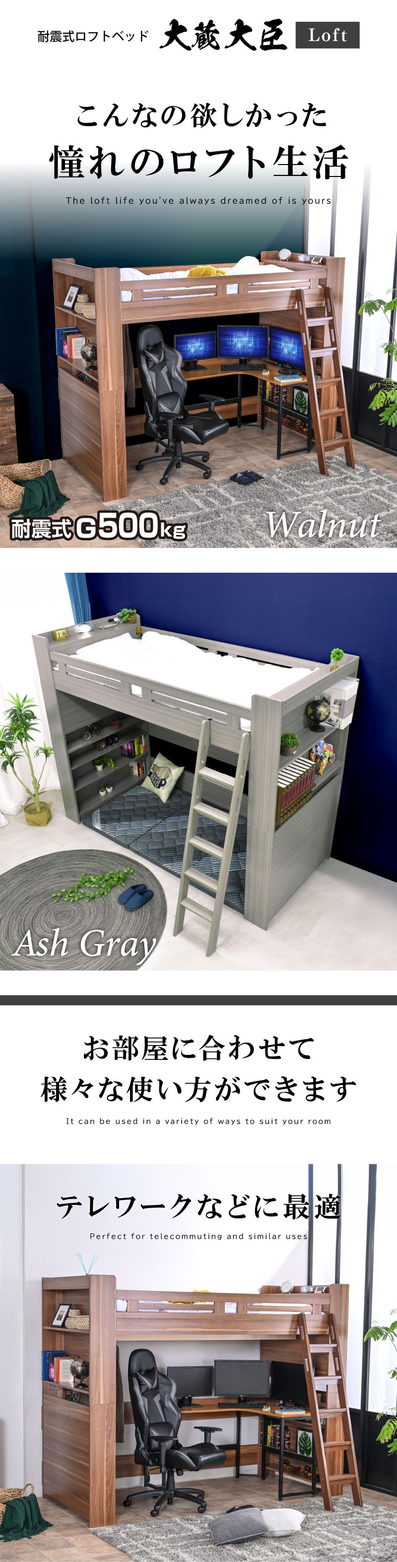 ロフトベッド ハイタイプ シングル 木製 子供 大人用 すのこ 机 デスク 耐震 シンプル コンパクト 北欧 大蔵大臣Loft 本体のみ / グレー / -ART