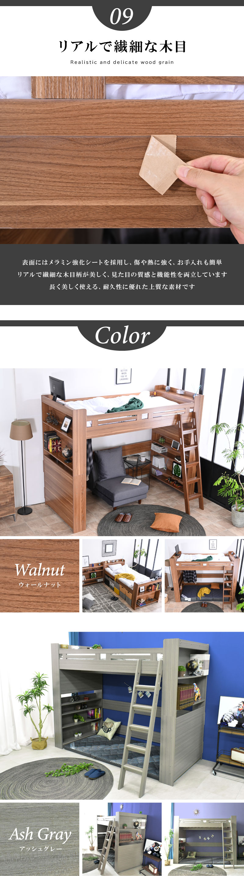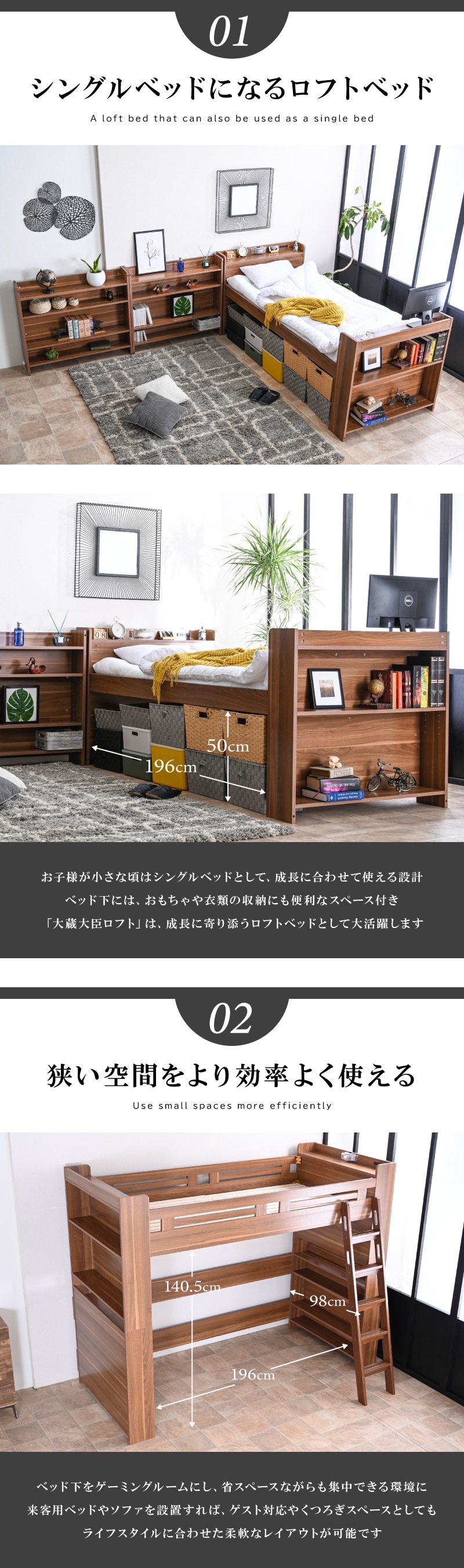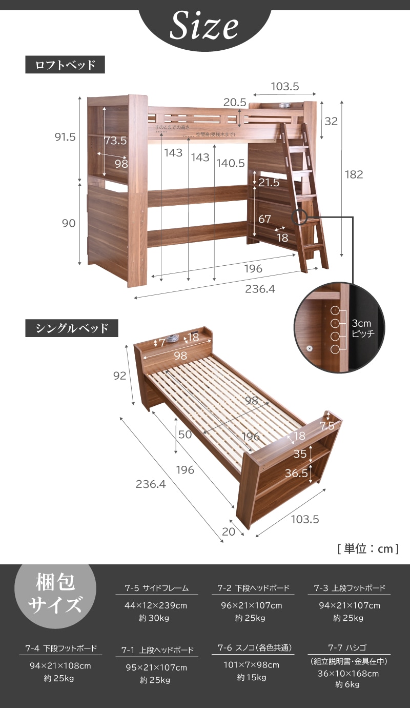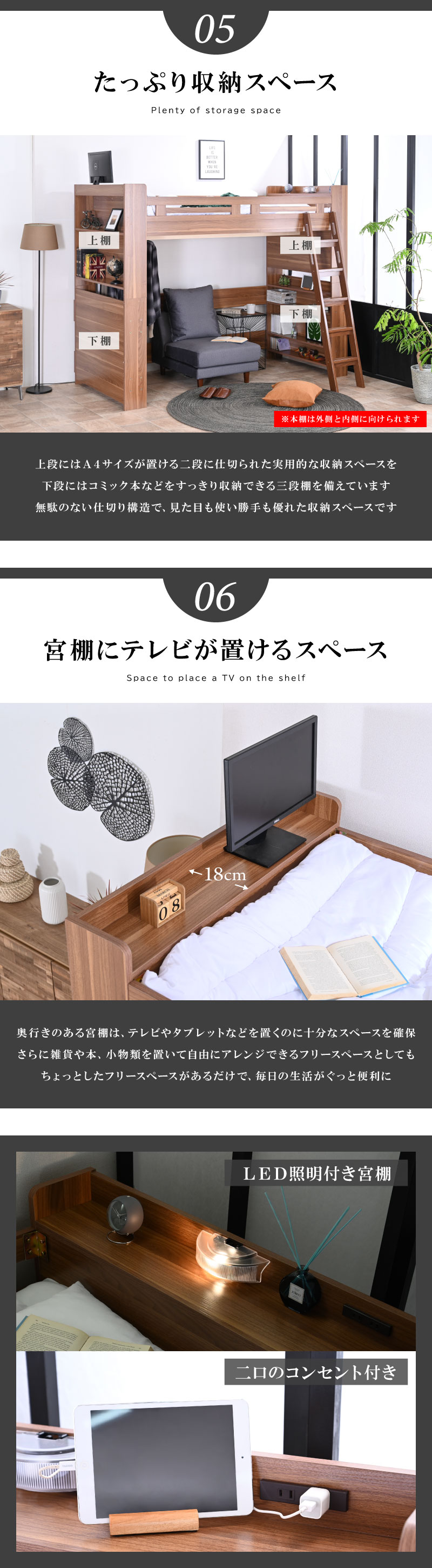 \シングルベッドになるロフトベッド/ ・ロフト下は自由に使えるフリースペース!狭い空間をより効率よくお使いいただけます ・たっぷりの収納スペース 縦長のものが置けるフリースペース 2段で仕切られてA4サイズも置けるスペース 3段で仕切られているから本をきれいに置ける 下段も左右に本棚スペースで余裕の収納力 ・宮棚にテレビが置けるスペース ・LED照明、2口コンセント付き ・中央に床板受桟木&丈夫な金具でガッチリ連結 さらにコの字でロフトを支える! ・LVLすのこでオールシーズン快適 ・キズに強く、強化紙仕上げのメラミン強化シート使用 ・ハシゴはどこでも設置可能 |