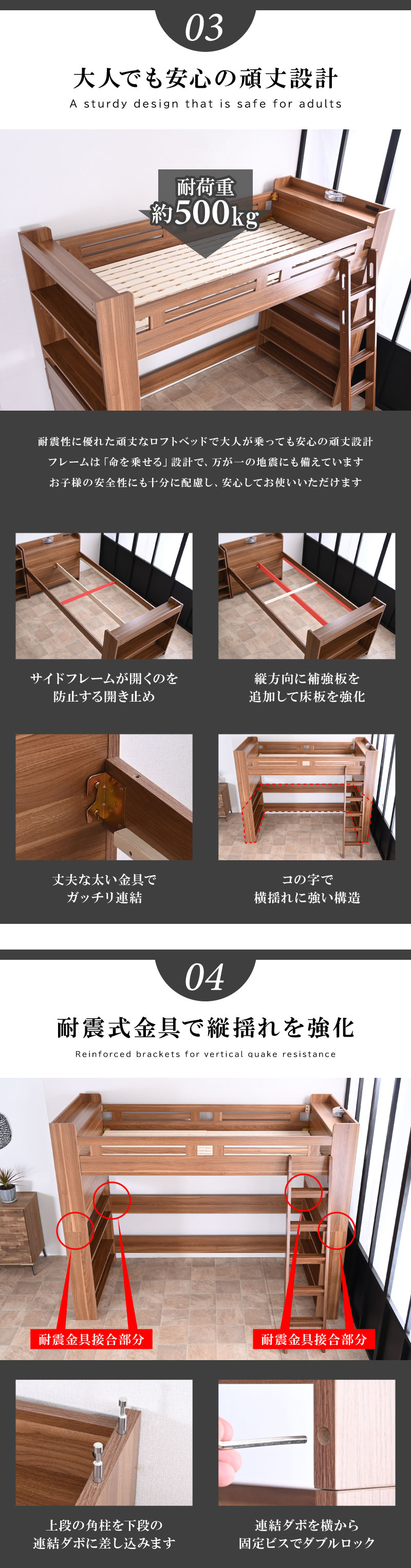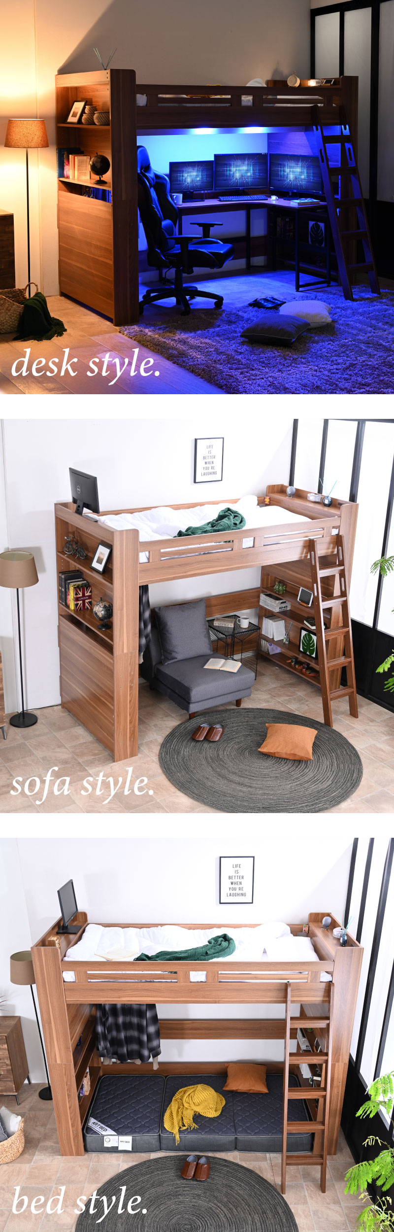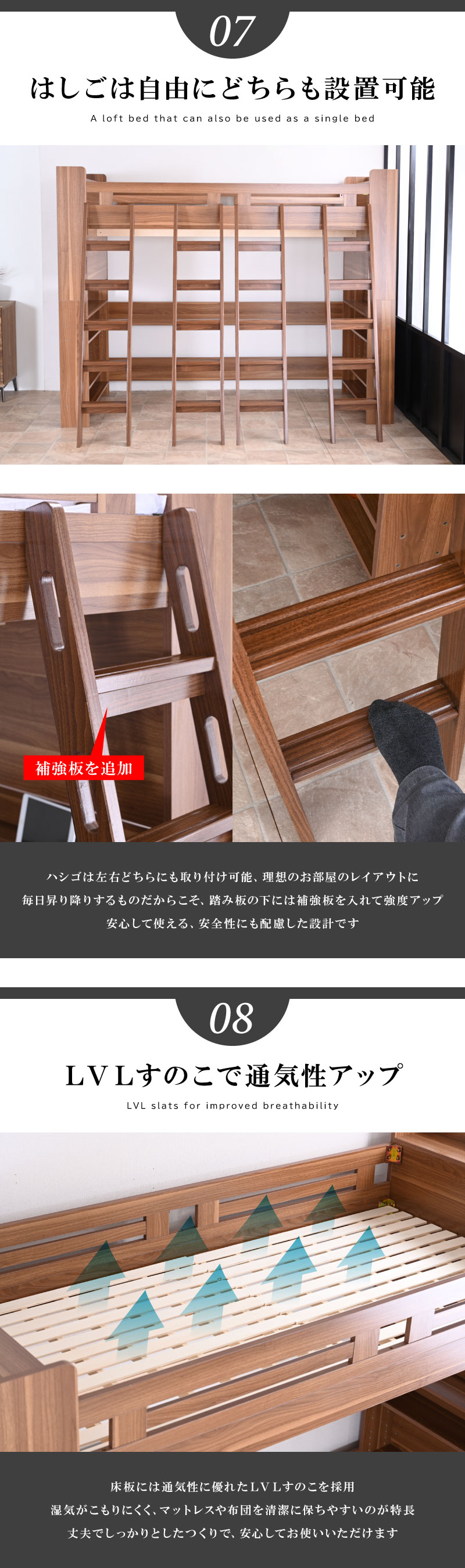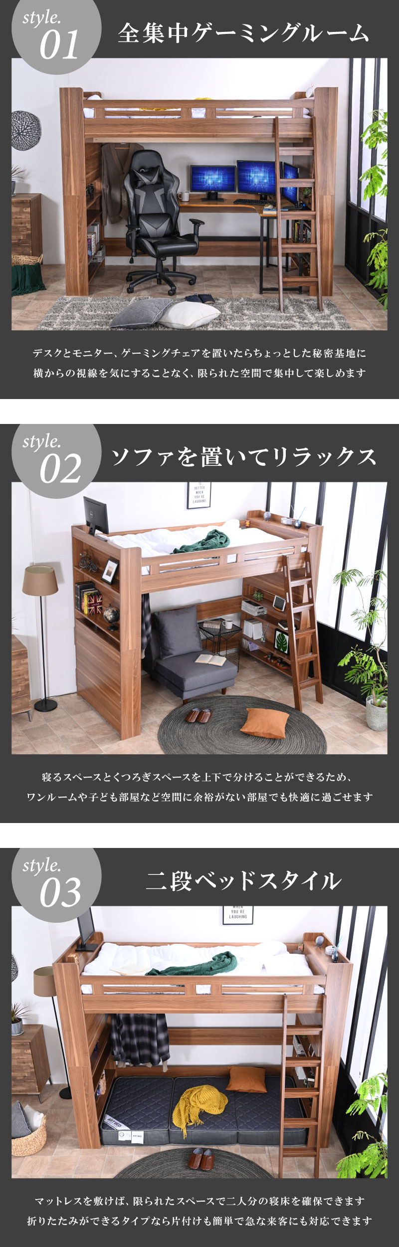\シングルベッドになるロフトベッド/ ・ロフト下は自由に使えるフリースペース!狭い空間をより効率よくお使いいただけます ・たっぷりの収納スペース 縦長のものが置けるフリースペース 2段で仕切られてA4サイズも置けるスペース 3段で仕切られているから本をきれいに置ける 下段も左右に本棚スペースで余裕の収納力 ・宮棚にテレビが置けるスペース ・LED照明、2口コンセント付き ・中央に床板受桟木&丈夫な金具でガッチリ連結 さらにコの字でロフトを支える! ・LVLすのこでオールシーズン快適 ・キズに強く、強化紙仕上げのメラミン強化シート使用 ・ハシゴはどこでも設置可能 |