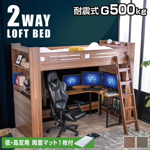 ロフトベッド ハイタイプ シングル 木製 子供 大人用 すのこ 机 デスク 耐震 シンプル コンパクト 北欧 大蔵大臣Loft / ウォールナット / (低反発 高反発 両面マットレス付) -ART
