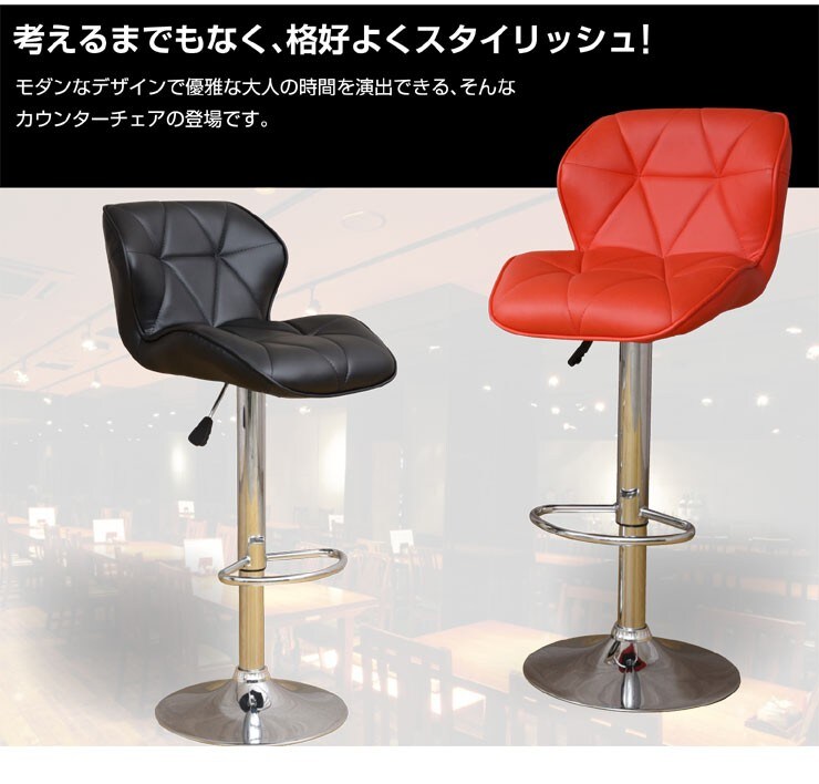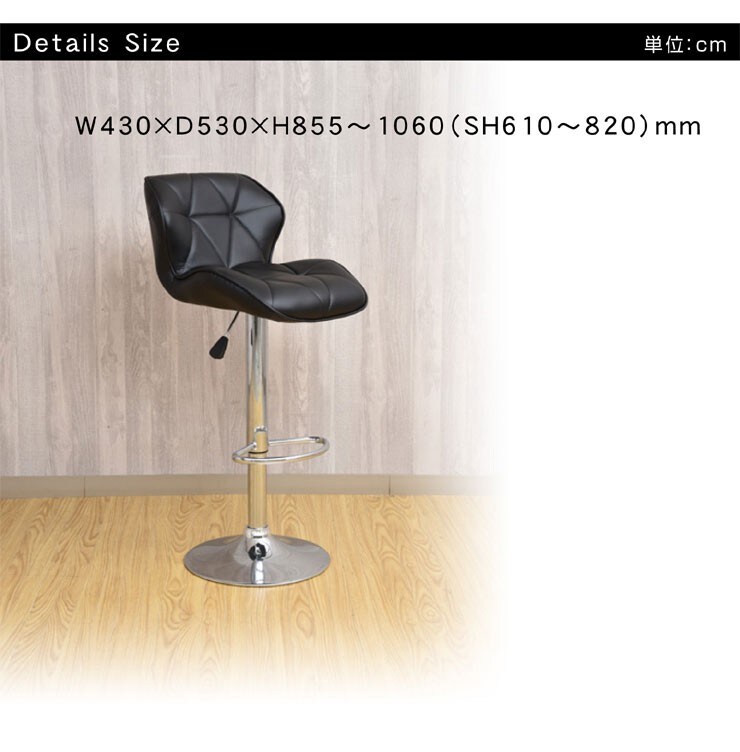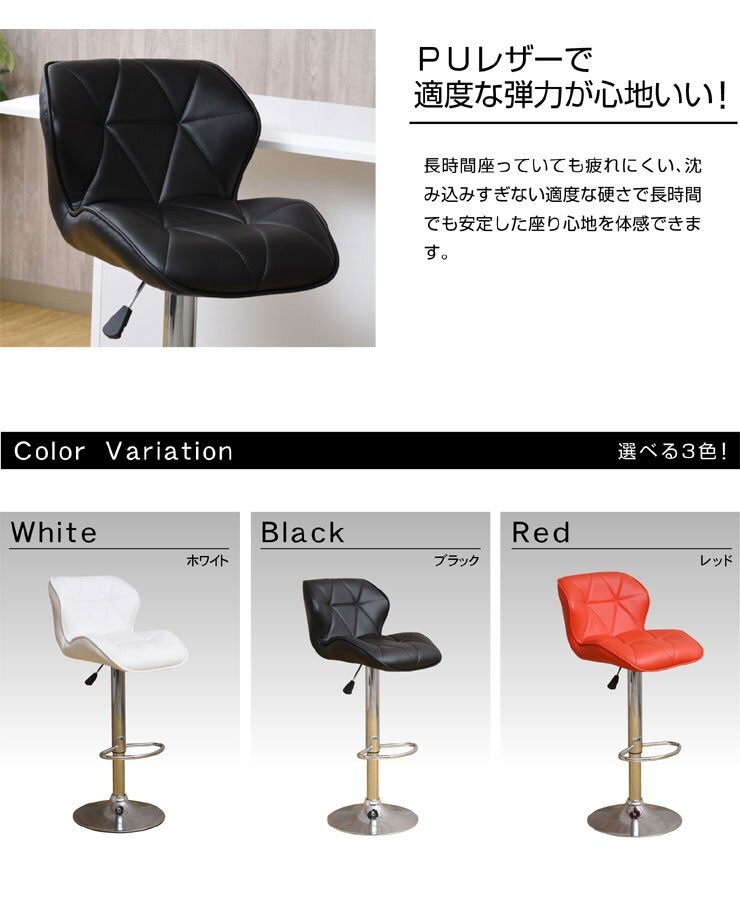 | 特徴 | 【お客様組立】 ・モダンなデザイン ・座面360度回転 ・レバーで簡単高さ調整 ・PUレザーで適度な弾力 ※画面等の違いによって多少色に違いが出る場合があります。予めご了承ください。 |
