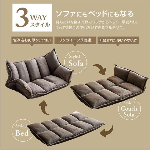 【完成品】 ・ふっくら極厚ボリュームのリクライニングソファ ・多彩なカラバリでコーデの幅もひろがる ・5か所×14段階リクライニングで自分だけのオーダーメイド ・どんなリラックス体勢でもホールド ・ソファにもベッドにもなる3WAYスタイル ・座面の高さは18cmで安心してくつろげる ・肌触りがよく、通気性が高いファブリック生地 ・コンパクトながらも余裕をもってくつろげるサイズ感 ・サッと広げて使えるため、来客用のソファとしても ・寒い季節はこたつ、その他の季節はローテーブルと相性抜群 ・ISO認定工場で生産だから安心の品質 |
