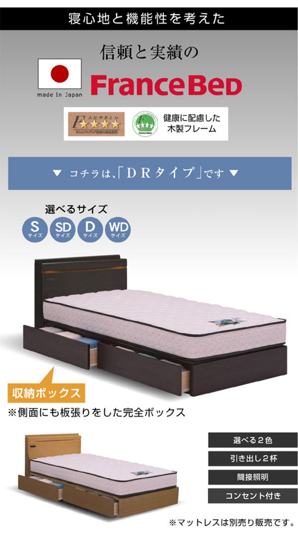 | 【SC・DR・LGタイプ共通】 間接照明・コンセント付き薄型キャビネットタイプ(奥行11cm) フランスベッド国内自社工場製 住環境と健康に配慮したフレーム、社内基準F☆☆☆☆仕様 【DRタイプ】 底面にも板張りした完全ボックス仕様 |