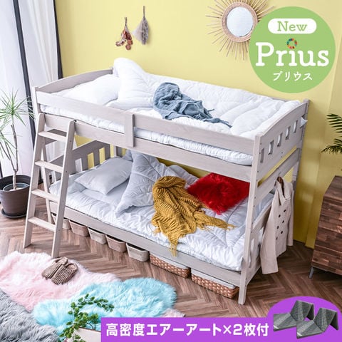 二段ベッド 2段ベッド ベッド 耐震 耐荷重300kg 頑丈 天然木 竹製 分割 分離 はしご 木製 LVLすのこ SDGs 収納 NEWプリウス / ホワイト / (高密度エアアート2枚付) ーART