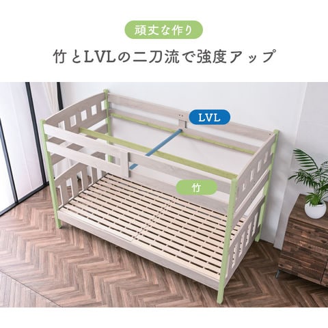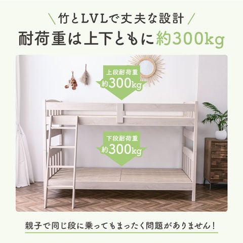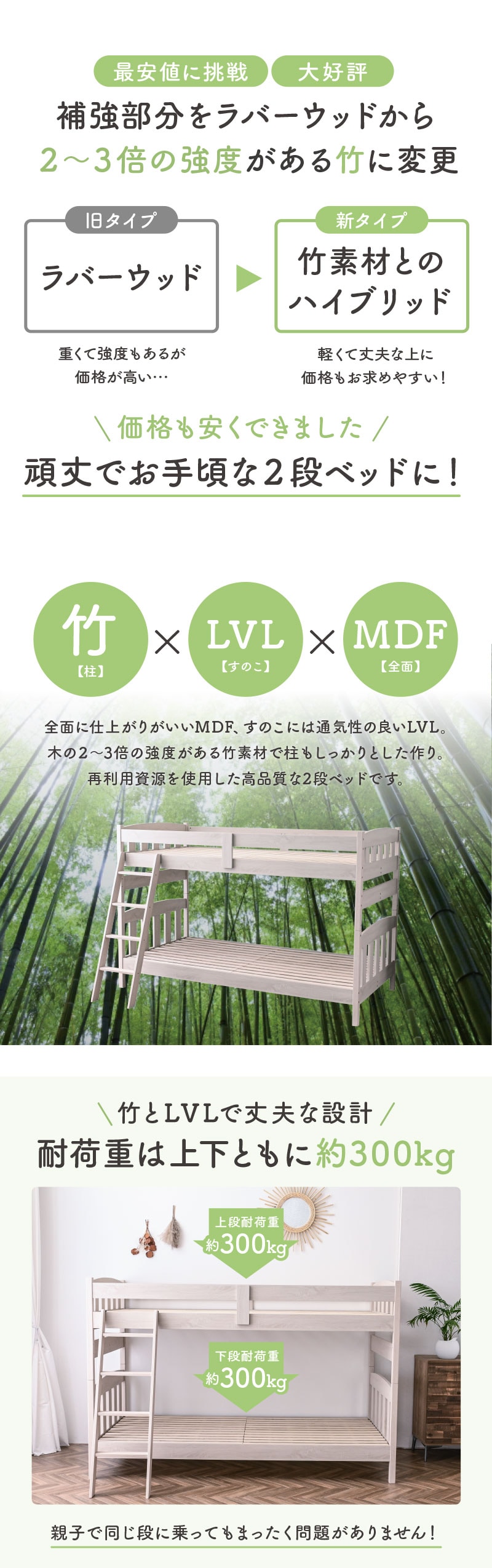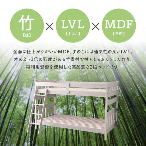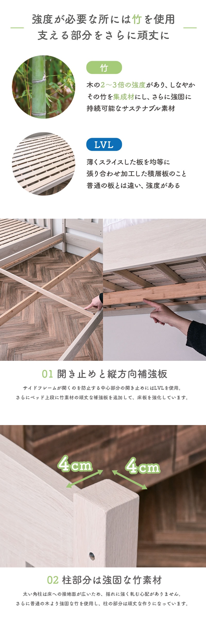 ・竹とLVLの二刀流で強度アップ ・柱部分は強固な竹素材 ・開き止めと縦方向補強板 ・頑丈な斜め掛けはしご ・地震対策・耐震機能を強化 ・MDFで統一感のある仕上がり ・自由な位置にはしごを設置 ・通気性の良いLVLスノコ ・ちょっとした隙間を有効活用 ・シングル2つに分割可能 |