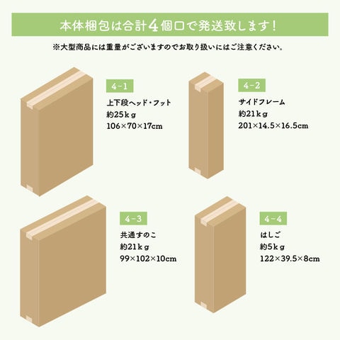 | 梱包サイズ(cm) | 【4-1 上下段ヘッド・フット】幅106×奥行き70×高さ17 25kg 【4-2 サイドフレーム】幅201×奥行き14.5×高さ16.5 21kg 【4-3 共通スノコ】幅99×奥行き102×高さ10 21kg 【4-4 ハシゴ】幅122×奥行き39.5×高さ8 5kg ※フレームのみは4個口、マットレス付きは6個口 |