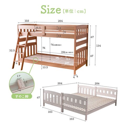 | サイズ(cm) | 【2段ベッド】幅204×奥行き103×高さ134 【シングルサイズ】幅103×奥行き204×高さ67 【キングサイズ】幅206×奥行き204×高さ67 |