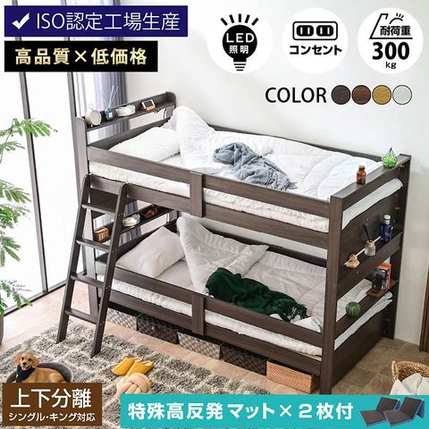 ・リアルで繊細な木目が美しいメラミン強化シートで傷がつきにくい ・シングルやキングになる長く使える分離型ベッド ・金属製の連結金具で安定感抜群&安心 ・連結ダブルロックでしっかり支える ・上段中央に補強板を追加して強度をアップ ・補強板と開き止めで支える、丈夫なつくり ・上下段LED照明・コンセント、宮棚付き ・小物が置けるスペース ・上りやすい斜めハシゴタイプ ・ハシゴはスペースに合わせて自由に移動 ・ベッドの脚に傷防止フェルト付き ・オールシーズン快適な通気性抜群のLVLすのこ ・丈夫で擦れにくく、撥水でお手入れが簡単 ・高さがあるからお掃除ロボットもOK! |